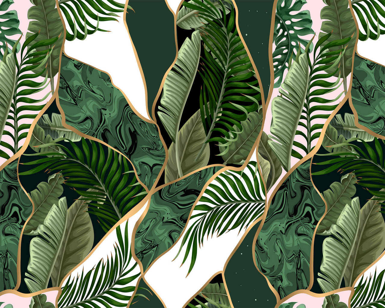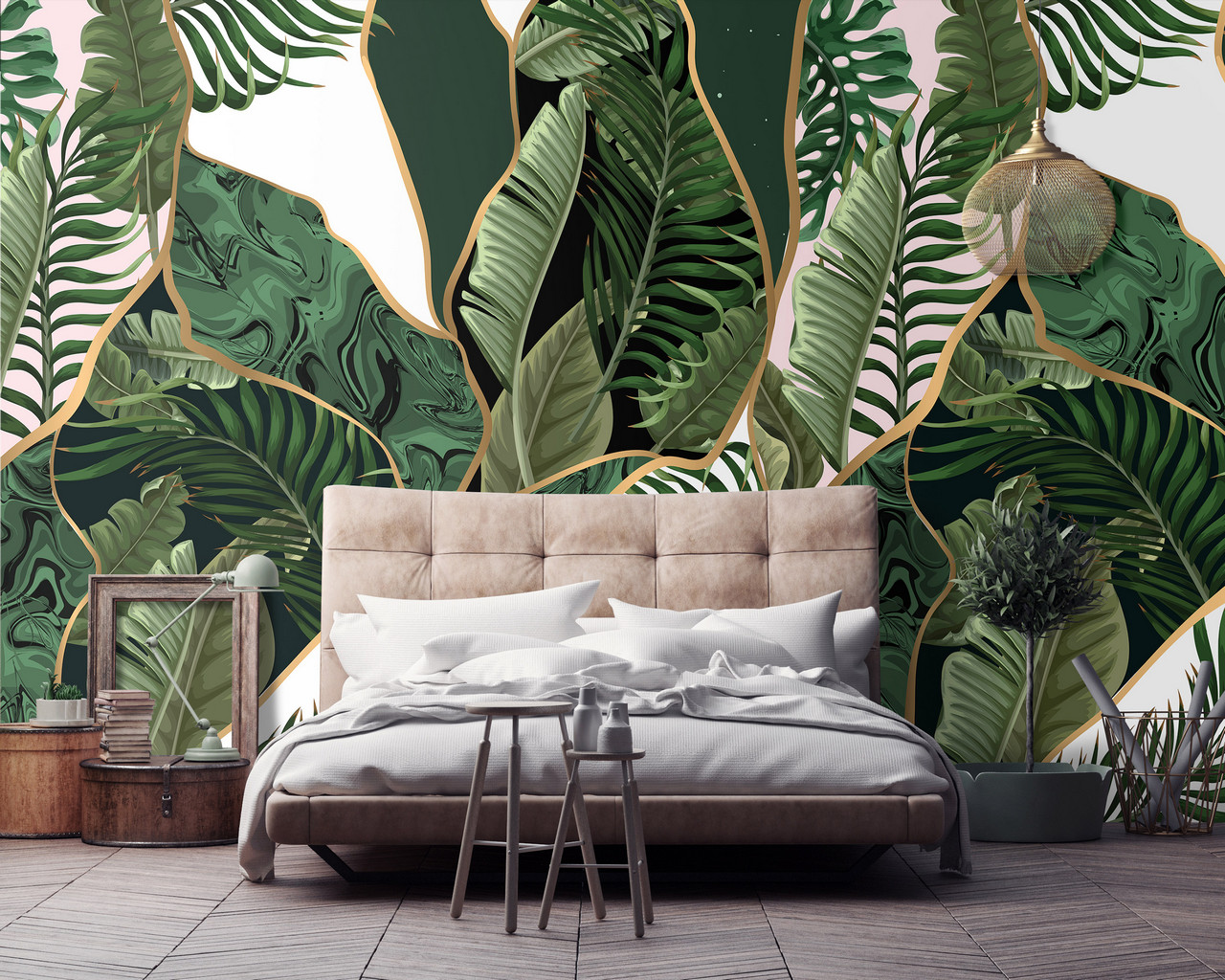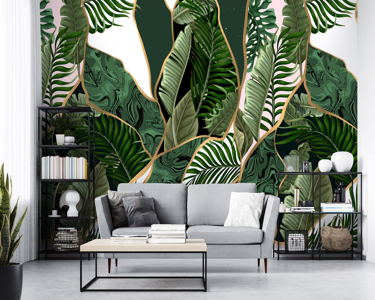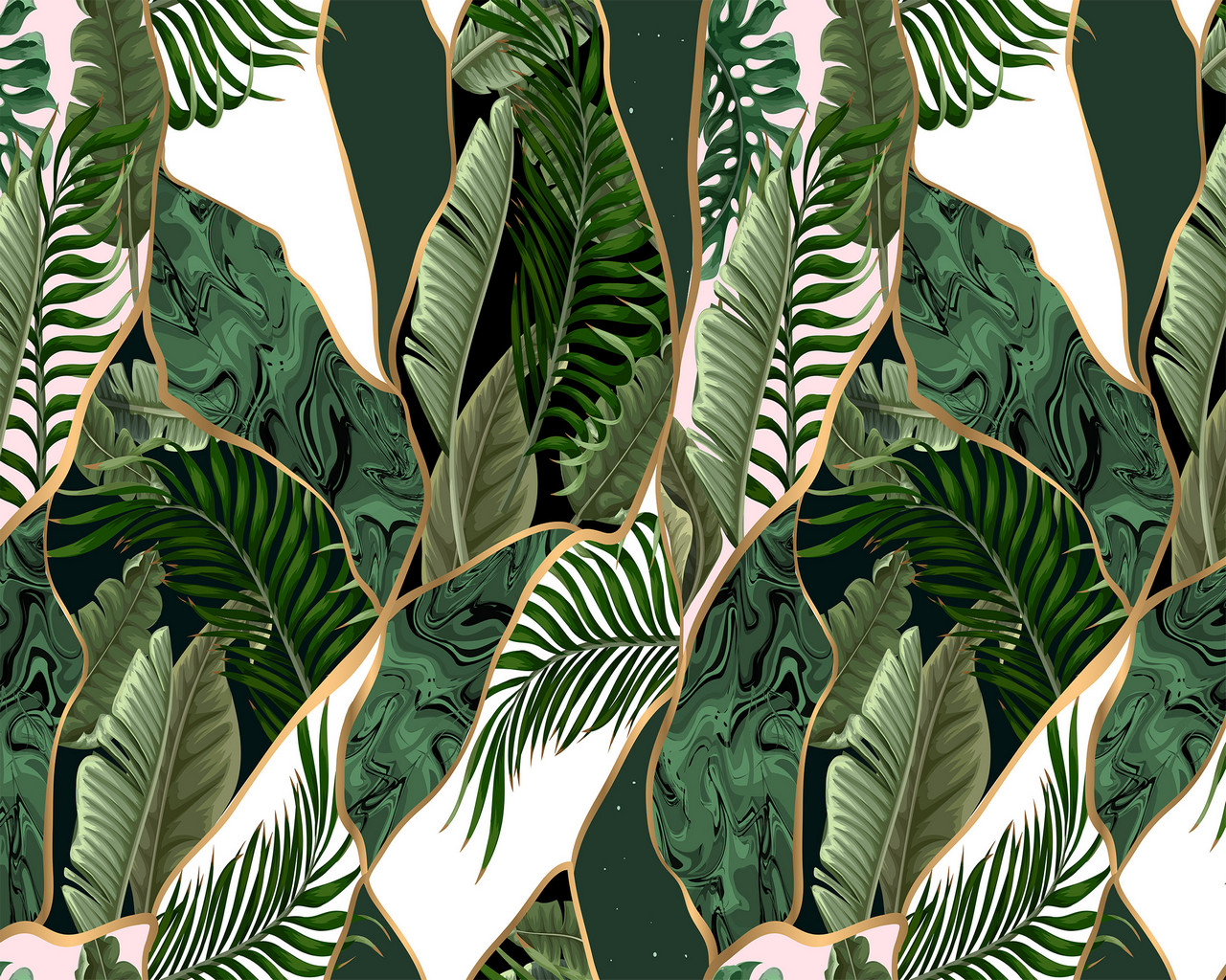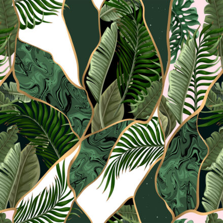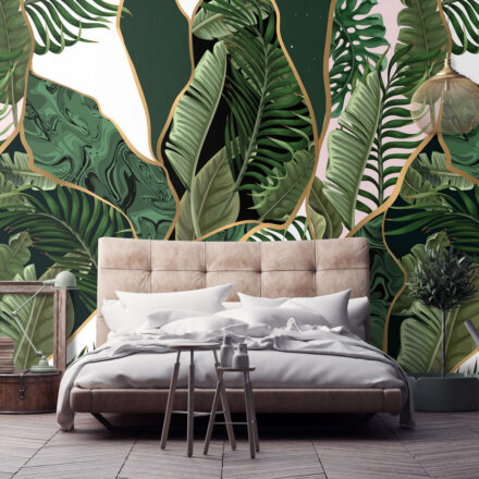 Modern fotótapéta, melynek levélmintája geometriai mintával párosul.