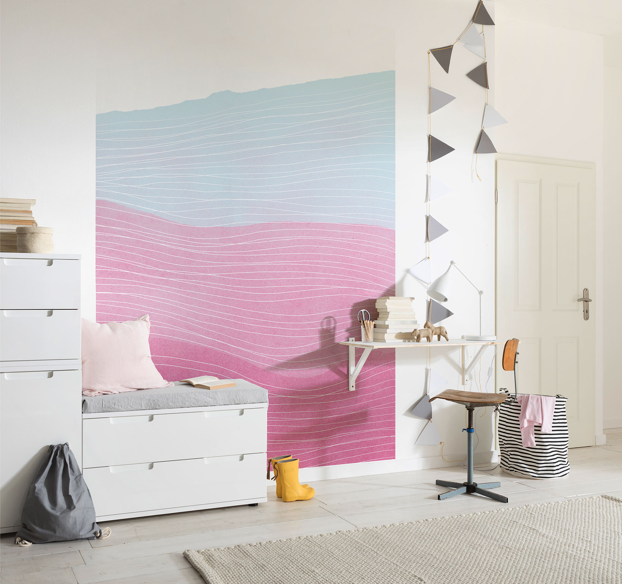 Rózsaszín absztrakt mintás tapéta, melyben a nyugalmat sugárzó hullámvonalak keverednek a mozgalmas, élénk színekkel. Fiatalos, lendületes fotótapéta, mely frissességgel tölti meg az enteriőrt.