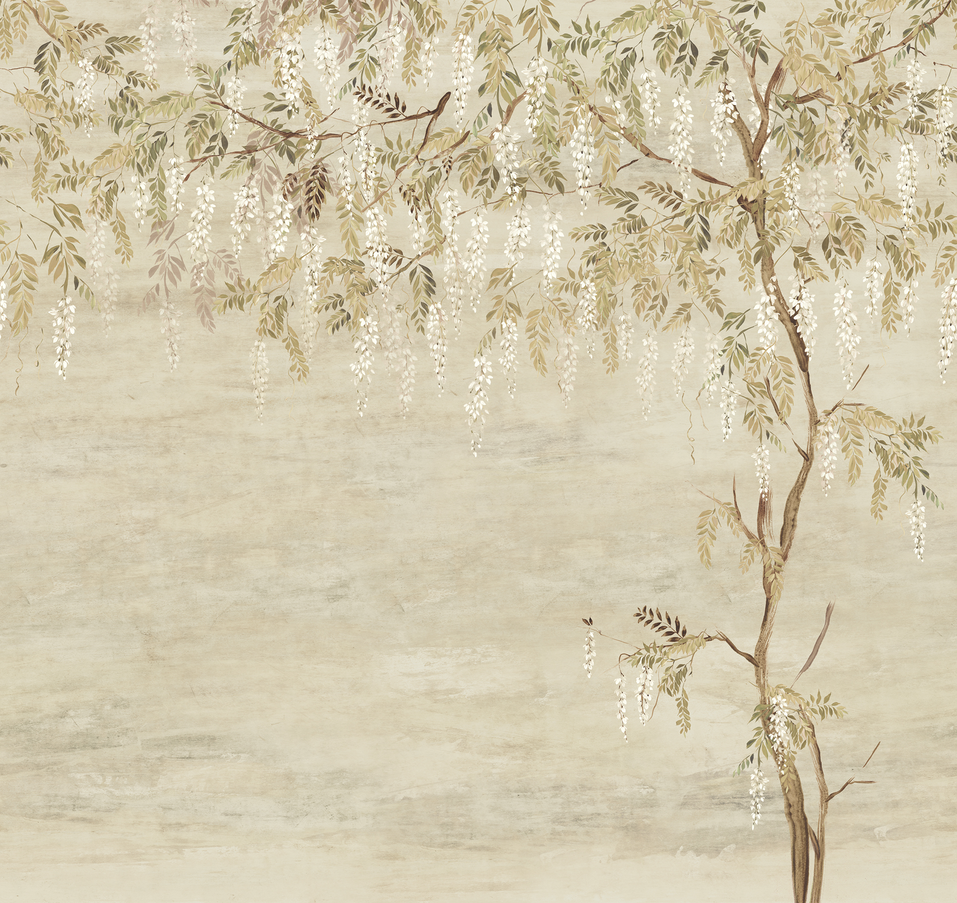 Akácfa virágos fotótapéta, melynek trendi mintáján a virágok kecsesen csüngnek lefelé a tapéta felső részéről. Lehajló virágai kellemes hátteret teremtenek egy kanapés nappaliban vagy a hálószoba ágy mögötti területén.