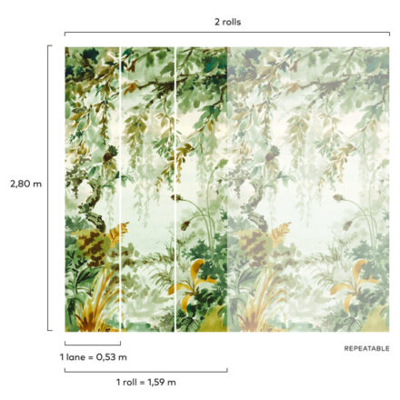 Ez a finoman festett, akvarell hatású vinyl fotótapéta egy csendes, zöldellő dzsungel világát idézi meg. A lágyan elmosódó lombkoronák, lecsüngő ágak és halvány zöld árnyalatok nyugodt, természetes atmoszférát teremtenek, mintha egy napsütötte erdei tisztásra nyílna a fal. A festményszerű megjelenés légies, mégis részletgazdag, így különleges mélységet ad a térnek.