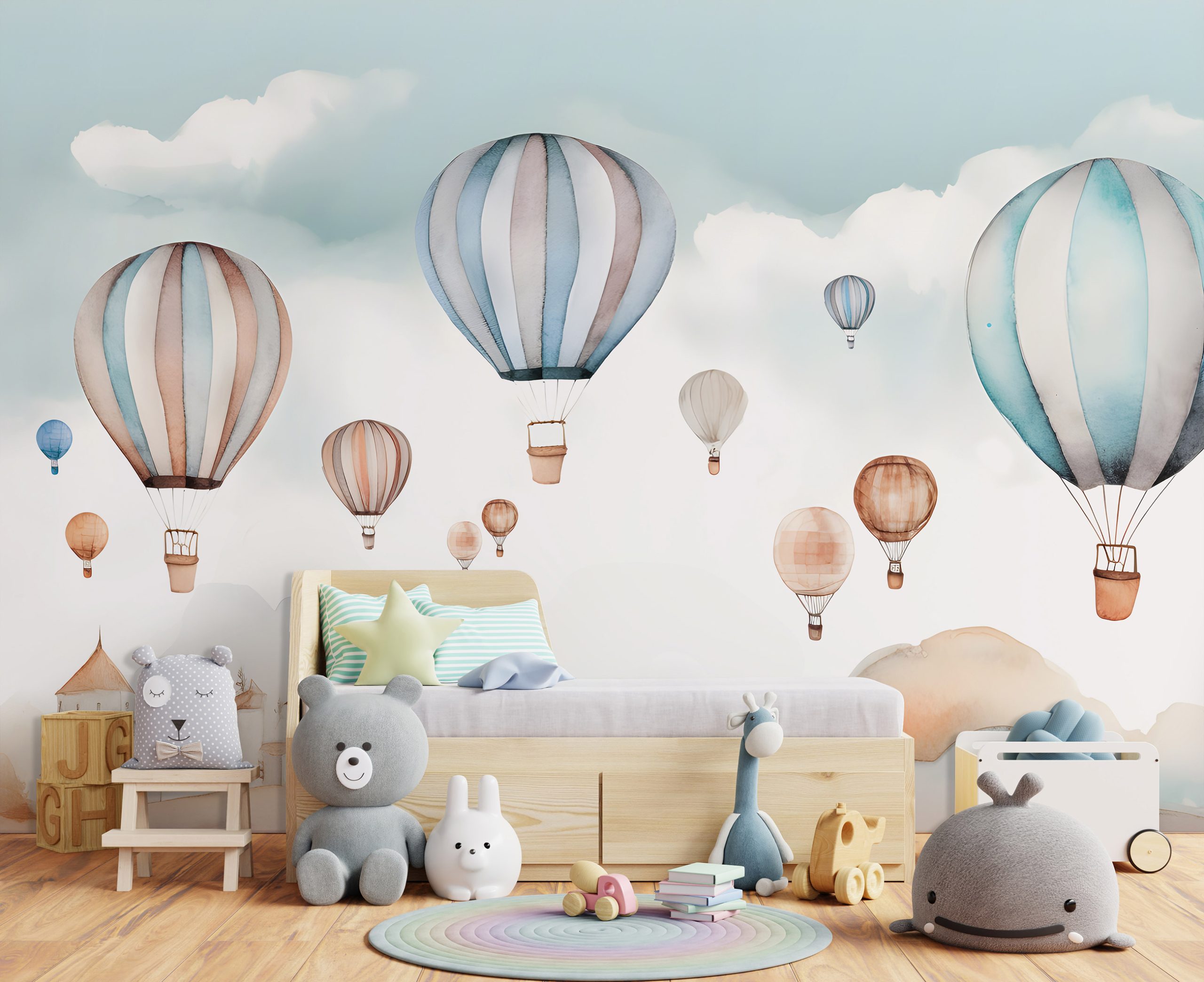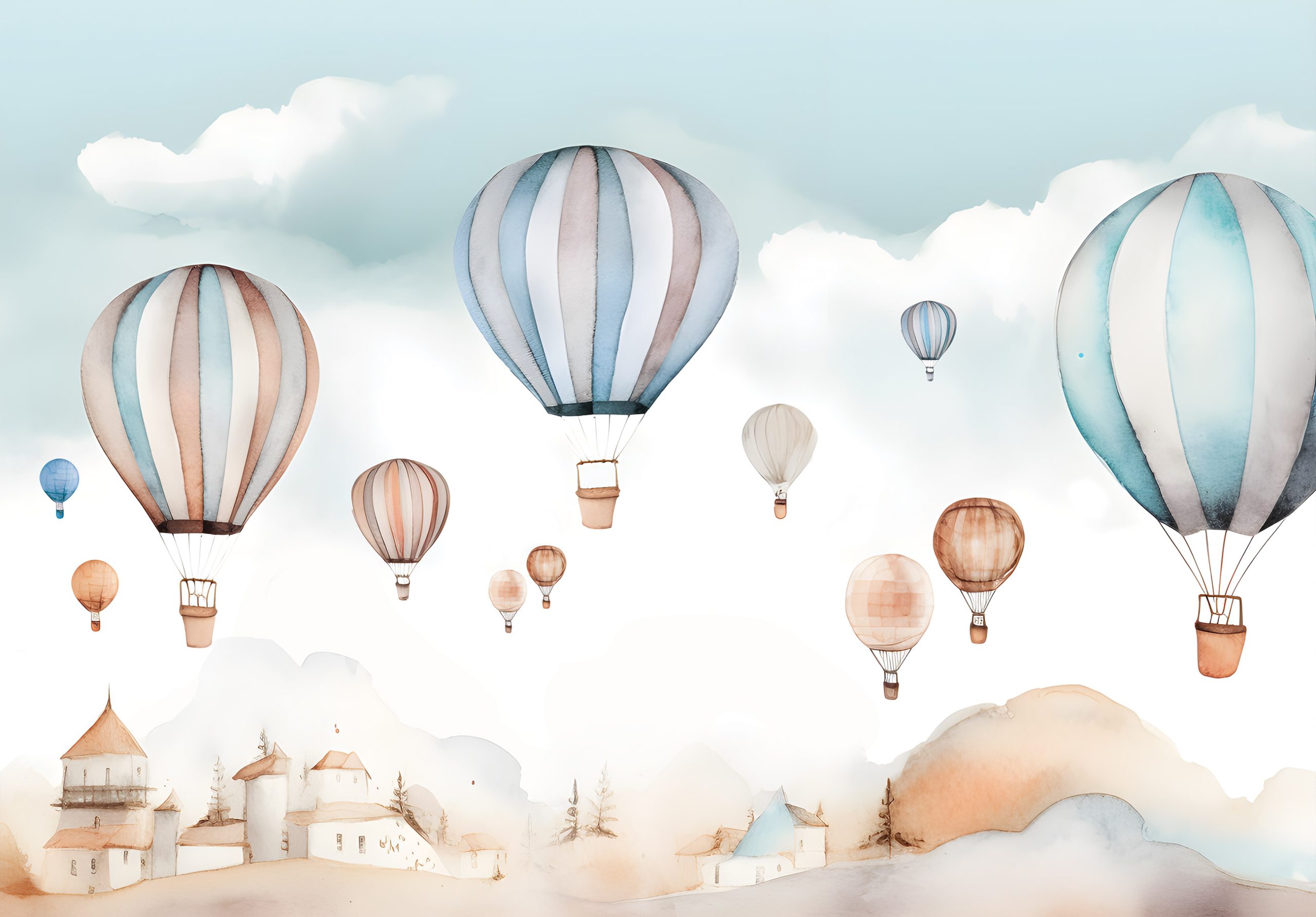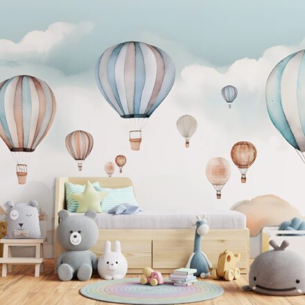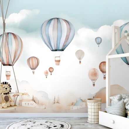 Kellemes pasztell árnyalatú fotótapéta, melynek az akvarelles háttér légies jelleget kölcsönöz. Nagyméretű hőlégballonok dekorálják, melyek kalandos utazásra hívnak.