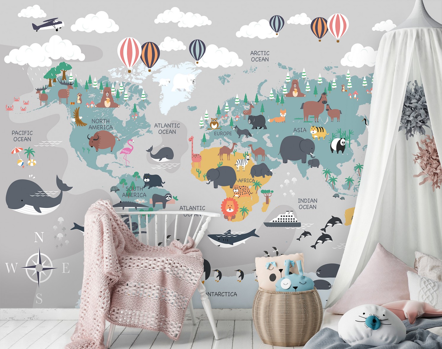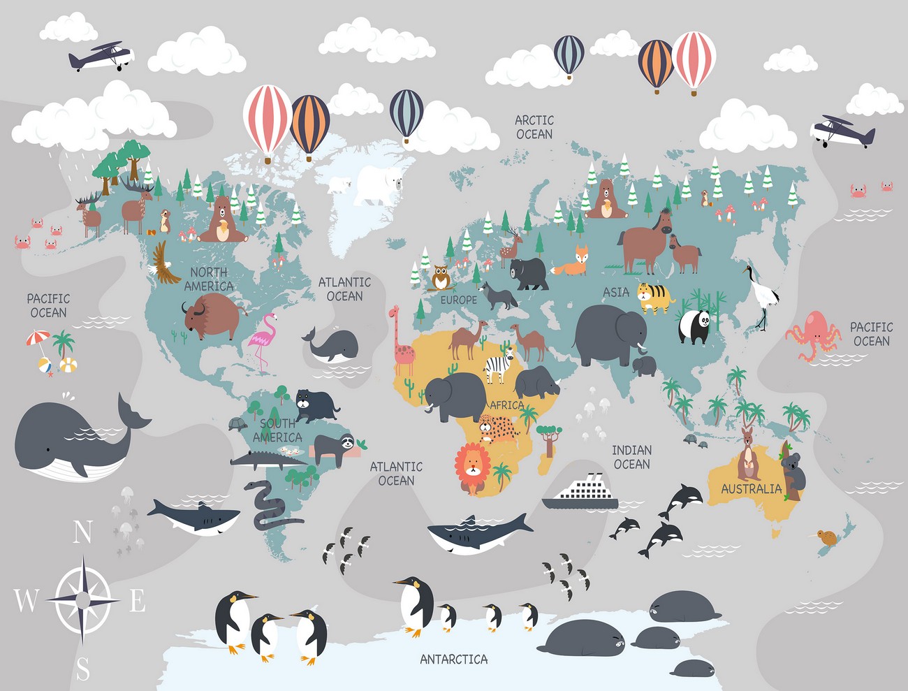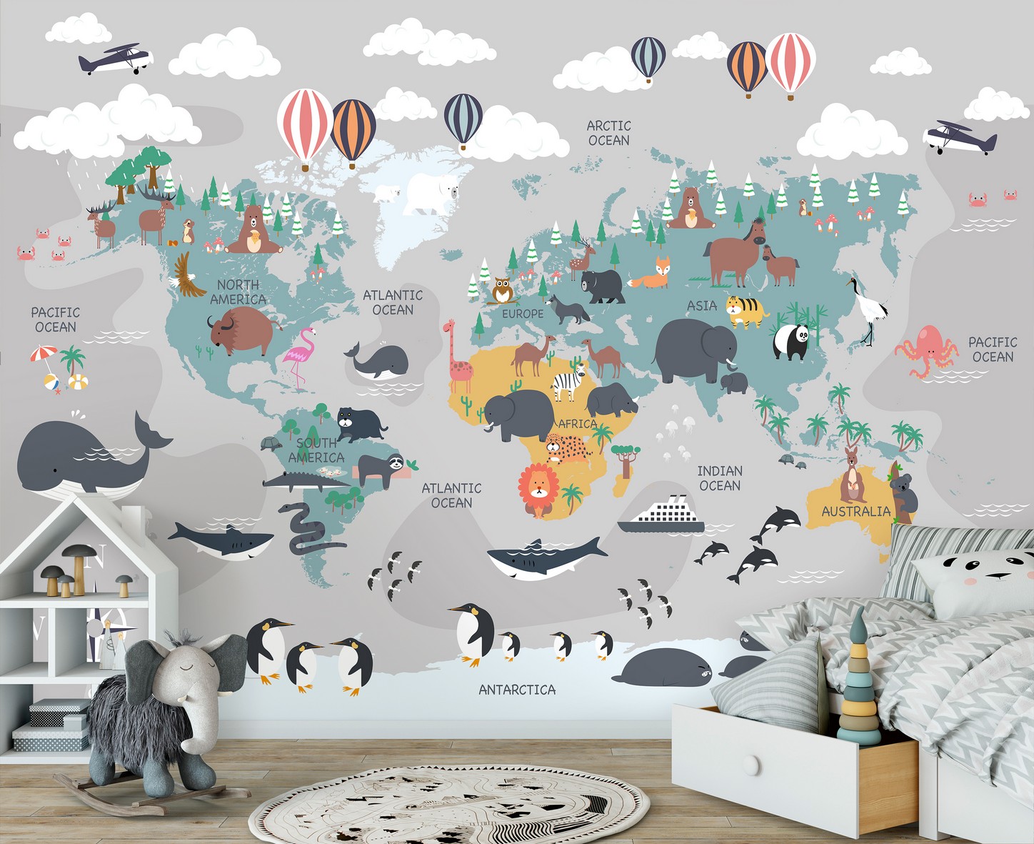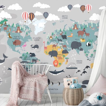 Állatos térkép fotótapéta gyerekszobába, mely nem csupán dekorálja a szobát, de beszélgetésre, a világ megismerésére is inspirál.