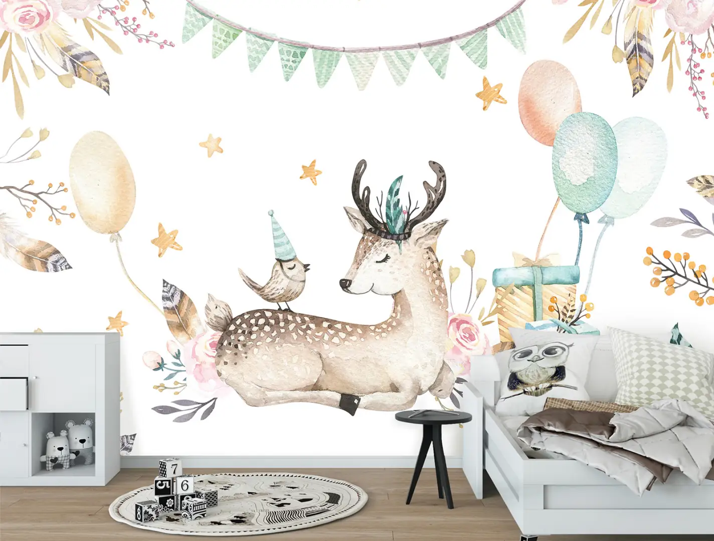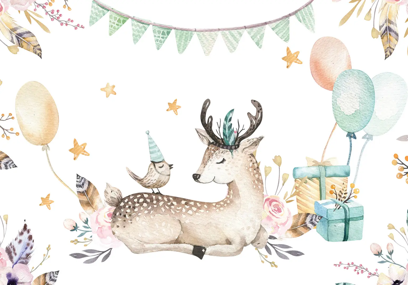 Állatos vlies gyerek fotótapéta, melyen kedvenc erdei állataink, a szarvas és a bagoly ünnepelnek közösen. Igazi születésnapi hangulat.
