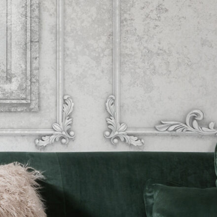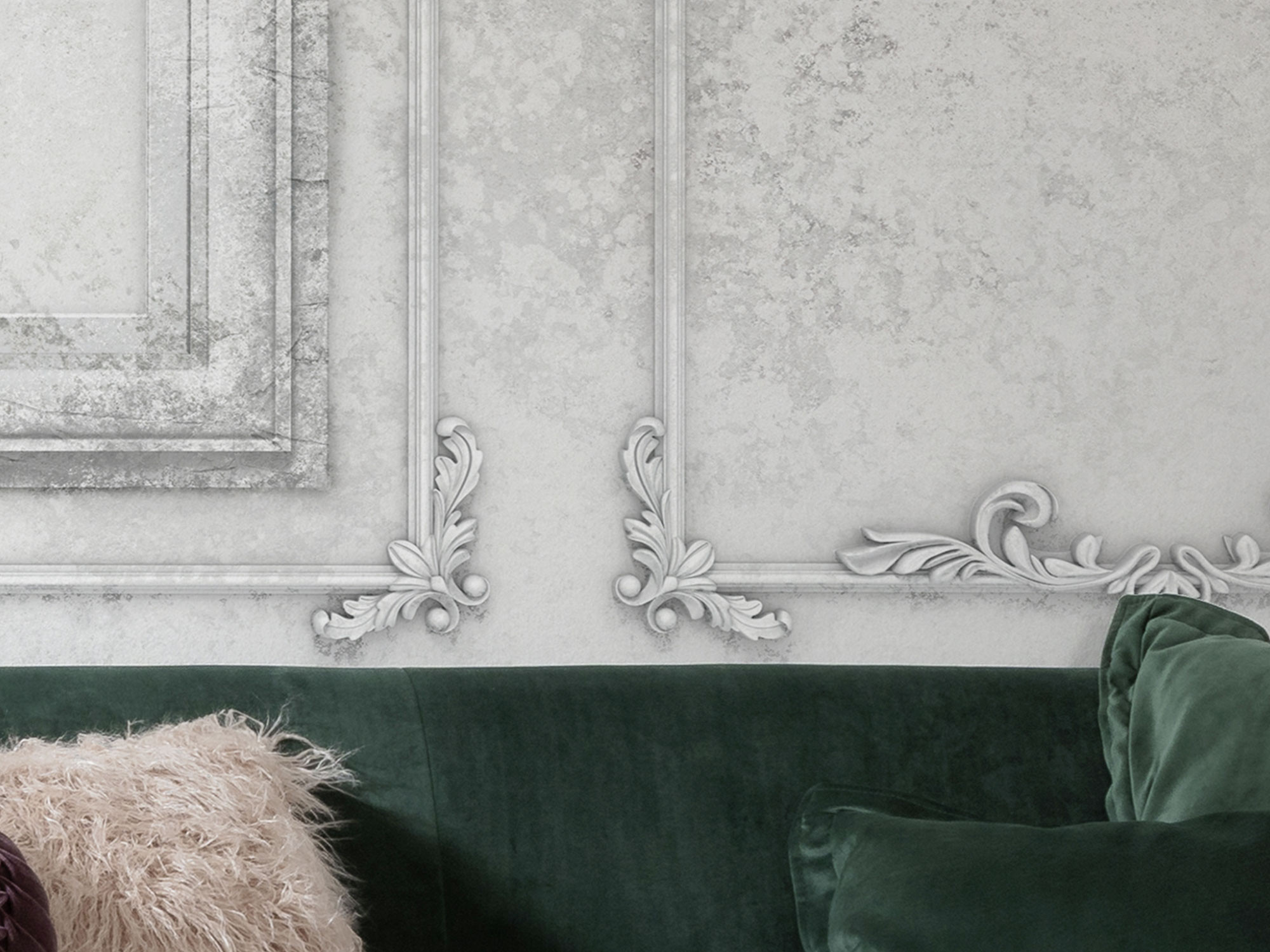 Visszatekintünk a múltba: az antik stukkóval díszített fotótapéta egyedi, különleges hangulatot teremt az enteriőrben.