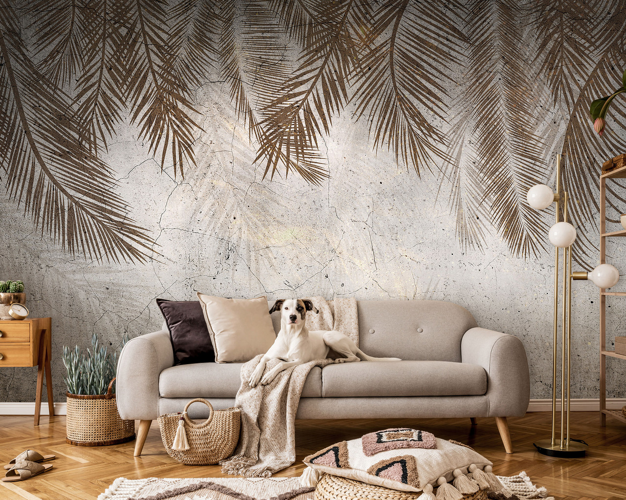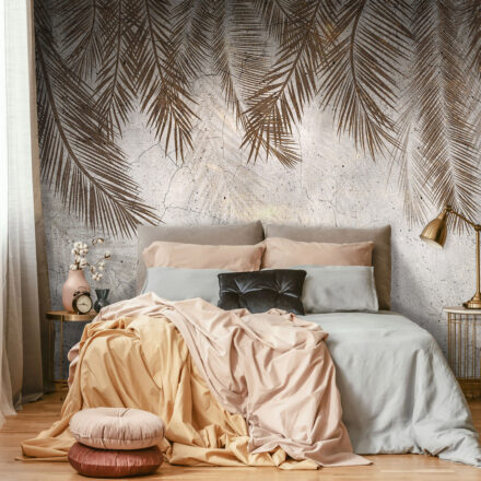 Töretlen népszerűségnek örvendő pálmaleveles fotótapéta, melyet különlegessé tesz az antik falat imitáló alap.