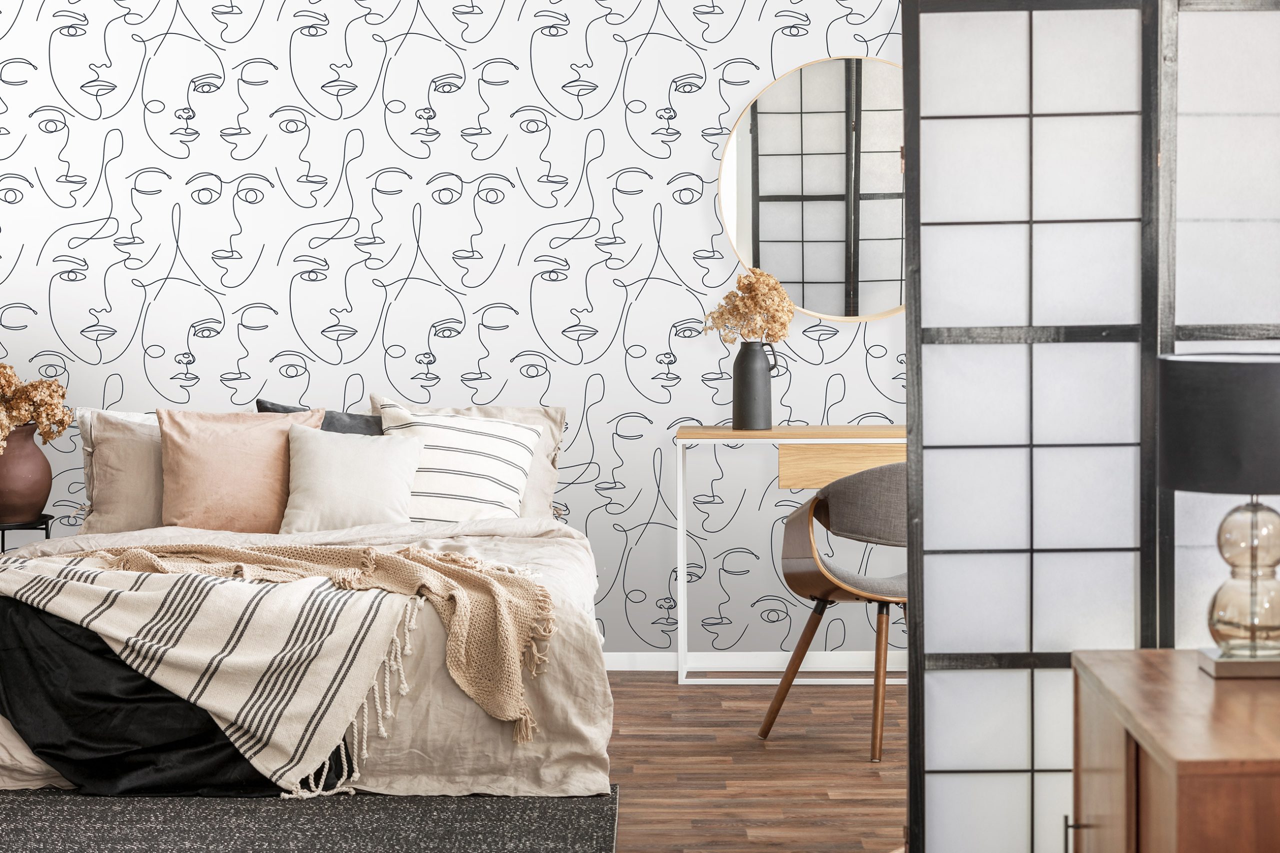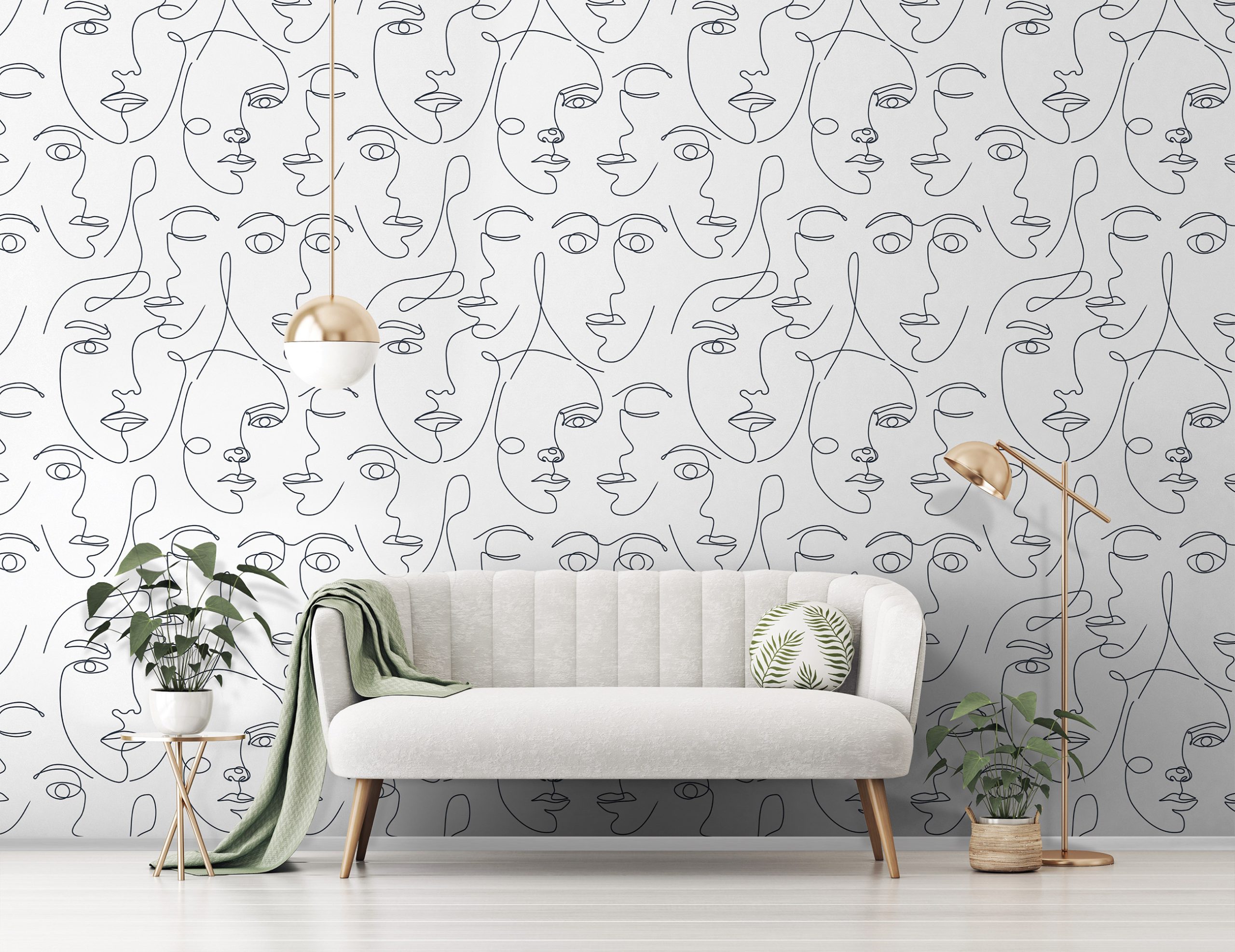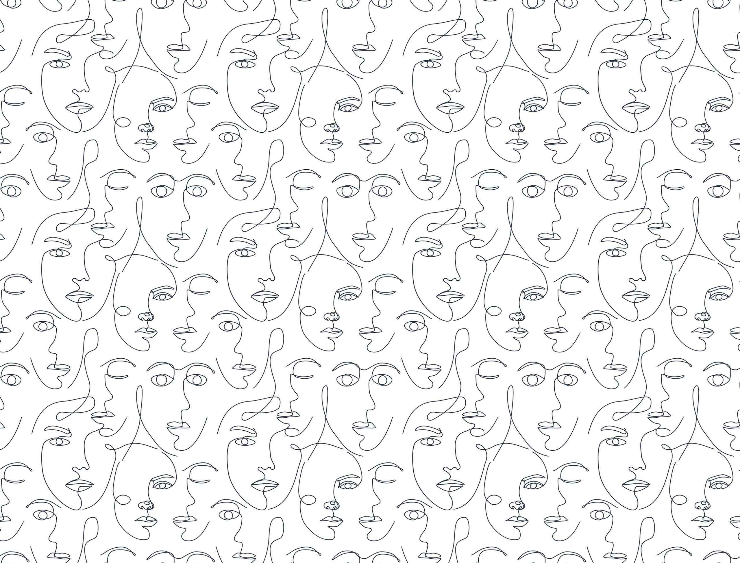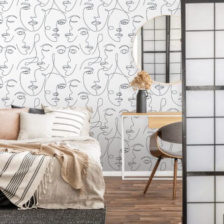Trendi fekete-fehér fotótapéta, melynek női arcvonalakból álló mintája az artdeco stílus jegyeit hordozza magán.