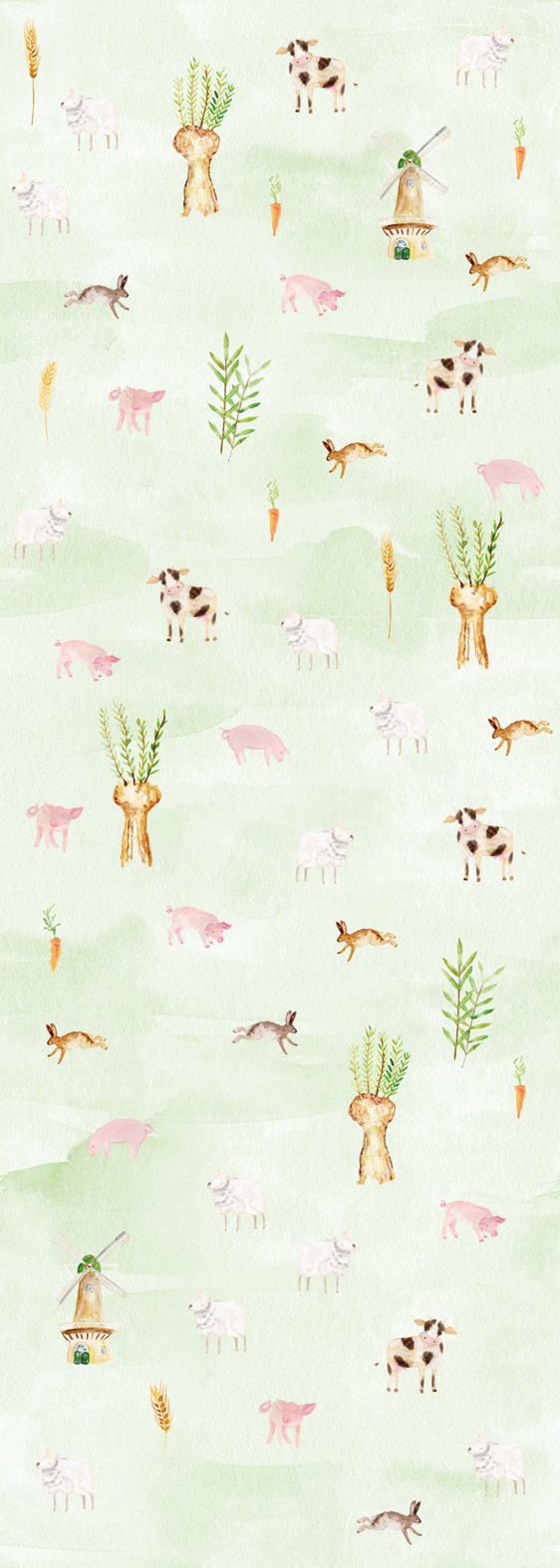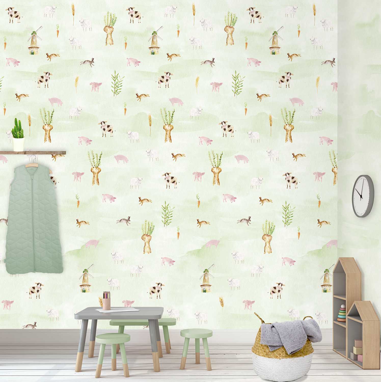 Kellemes, színátmenetes zöld alapszínen jelennek meg a kedves háziállatok. Bájos dekoráció, mely a gyerekszobában kellemes atmoszférát teremt.