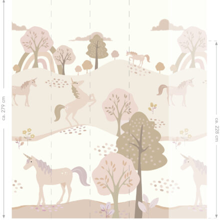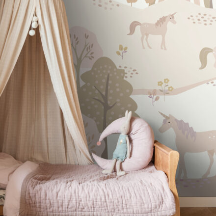 Kislányok álmai válnak valóra a fotótapétával, melyet a népszerű unikornis minta dekorál.