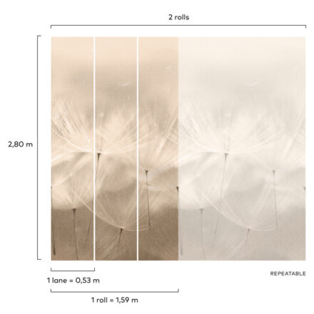 Ez a finom, légies vinyl fotótapéta a lebegő pitypangok könnyedségét idézi meg a púderes bézs árnyalatokban. A lágy tónusok és a szinte lebomló részletek nyugodt, harmonikus hátteret teremtenek, amely nem uralja a teret, mégis különleges atmoszférát ad neki.