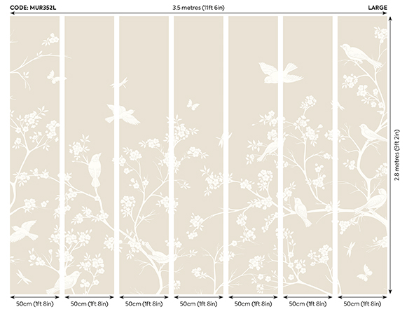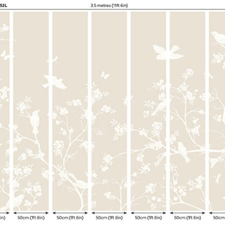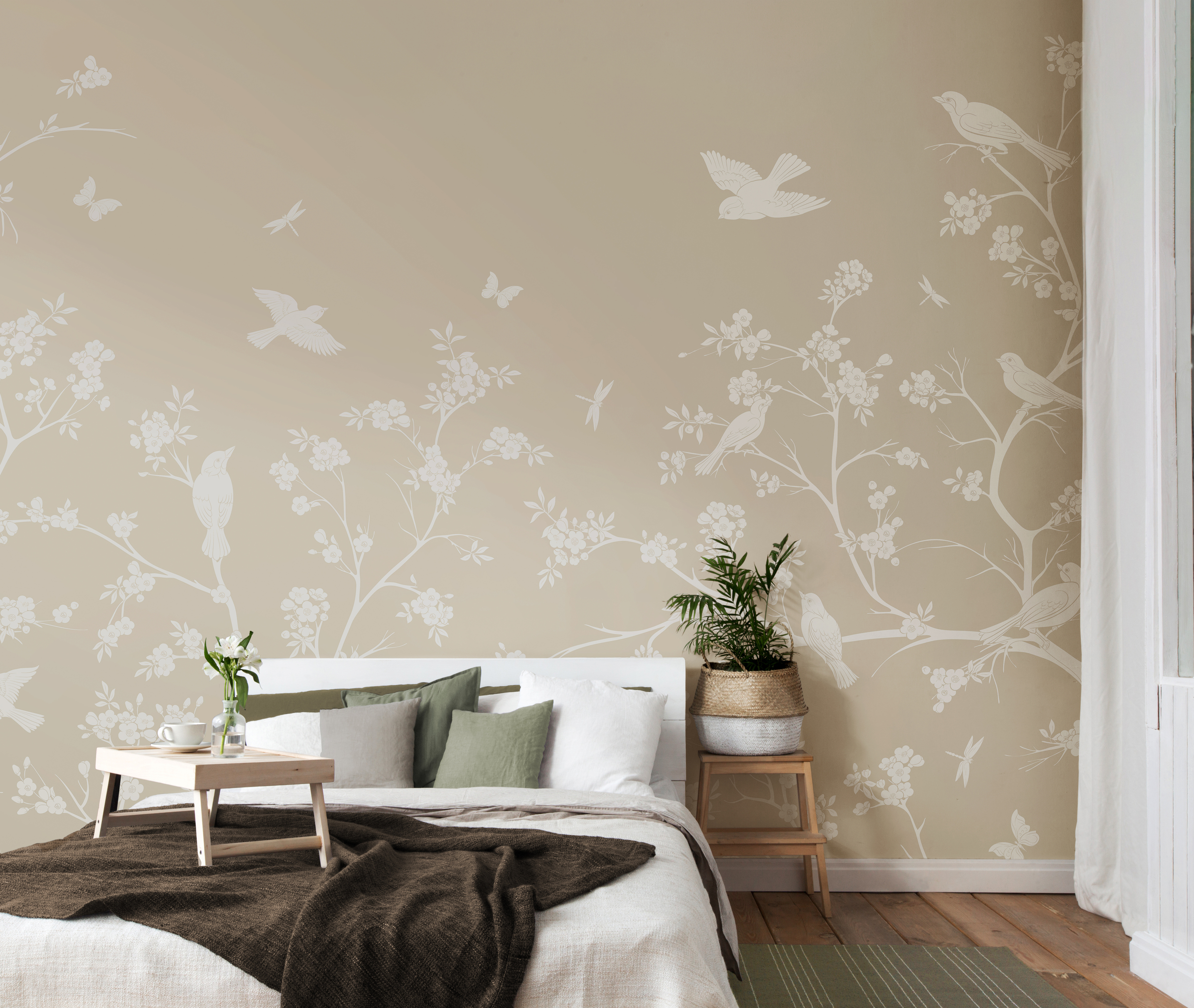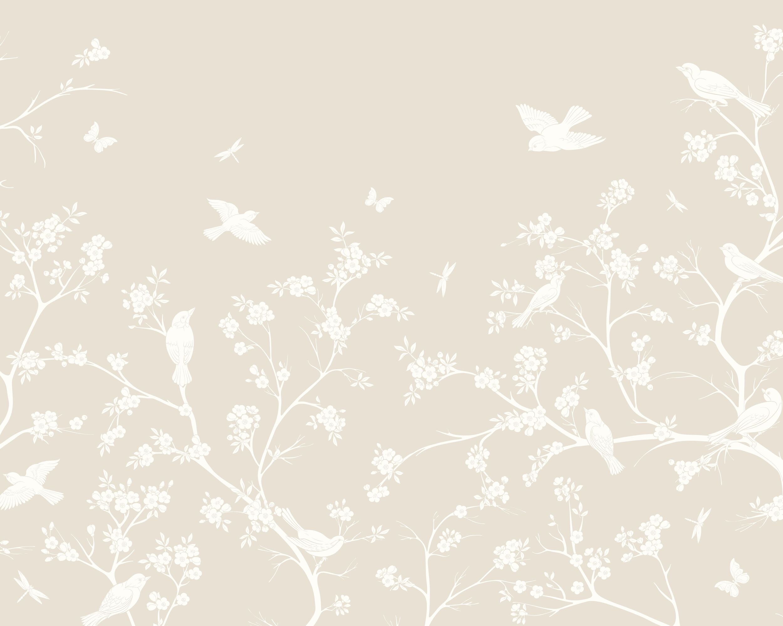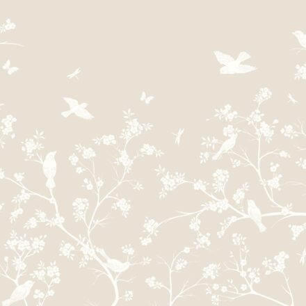 Bézses szürke chinoiserie fotótapéta virágzó ágakon ülő madarakkal, melyen a részletgazdag mintázat sziluettként rajzolódik ki az alapszínen. Elegancia és nemes egyszerűség párosul a keleties szépséget tükröző virágos mintában.