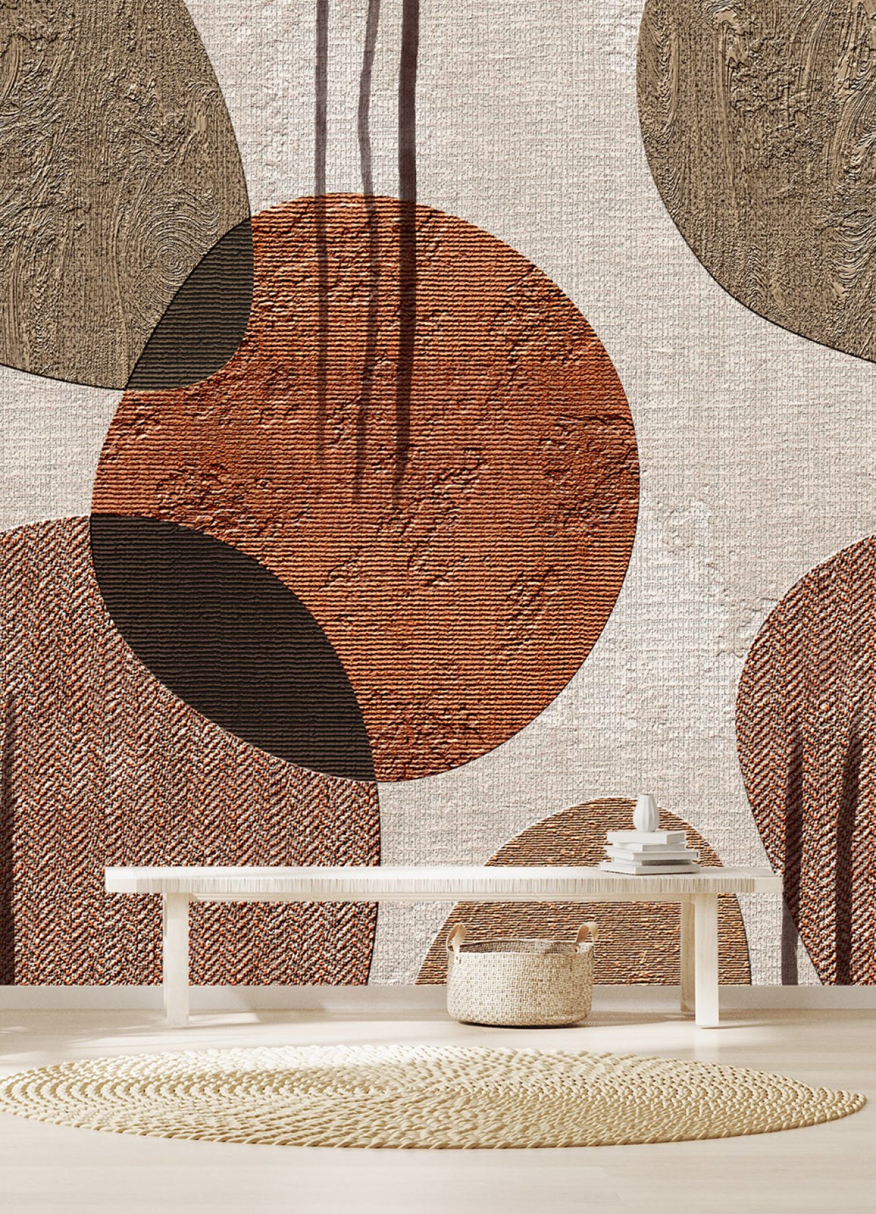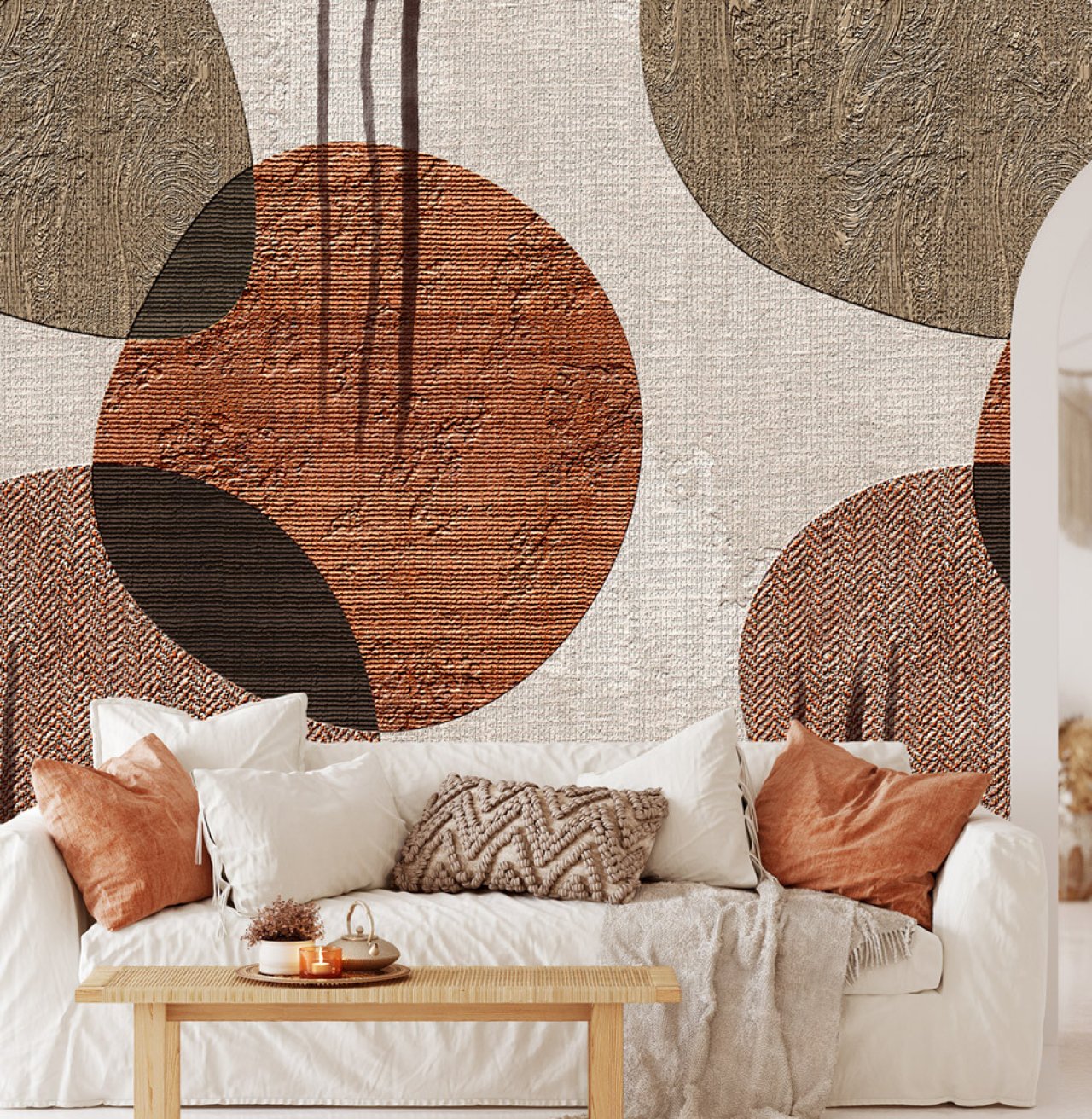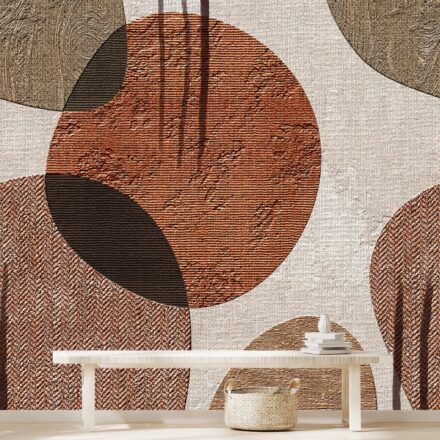 Boho stílusú fotótapéta barnás árnyalatokban, melyen körminták szövetet imitáló alapon jelennek meg. A natúr színárnyalatokban megjelenő fotótapéta kellemes, otthonos melegséget teremt az enteriőrben.