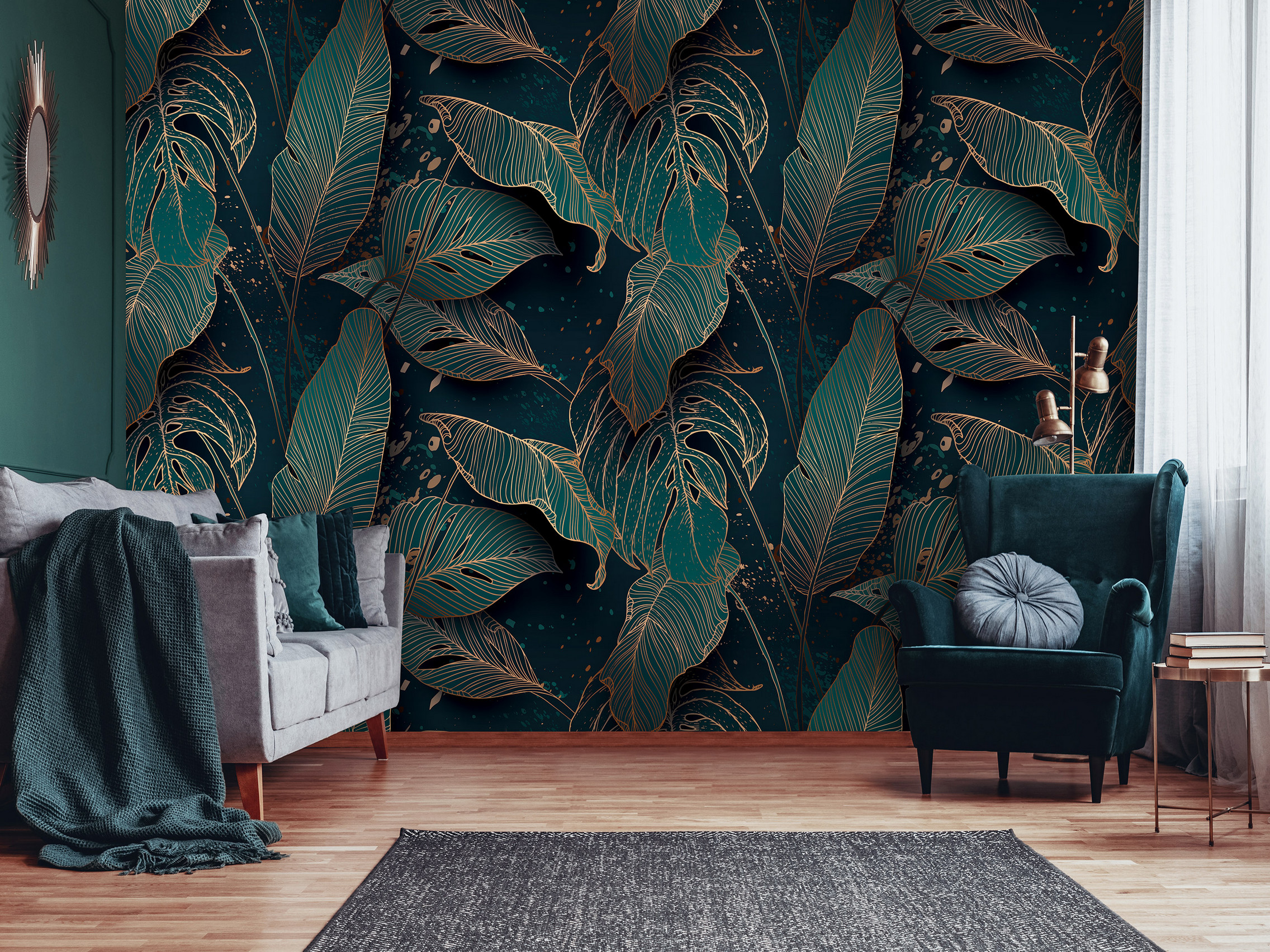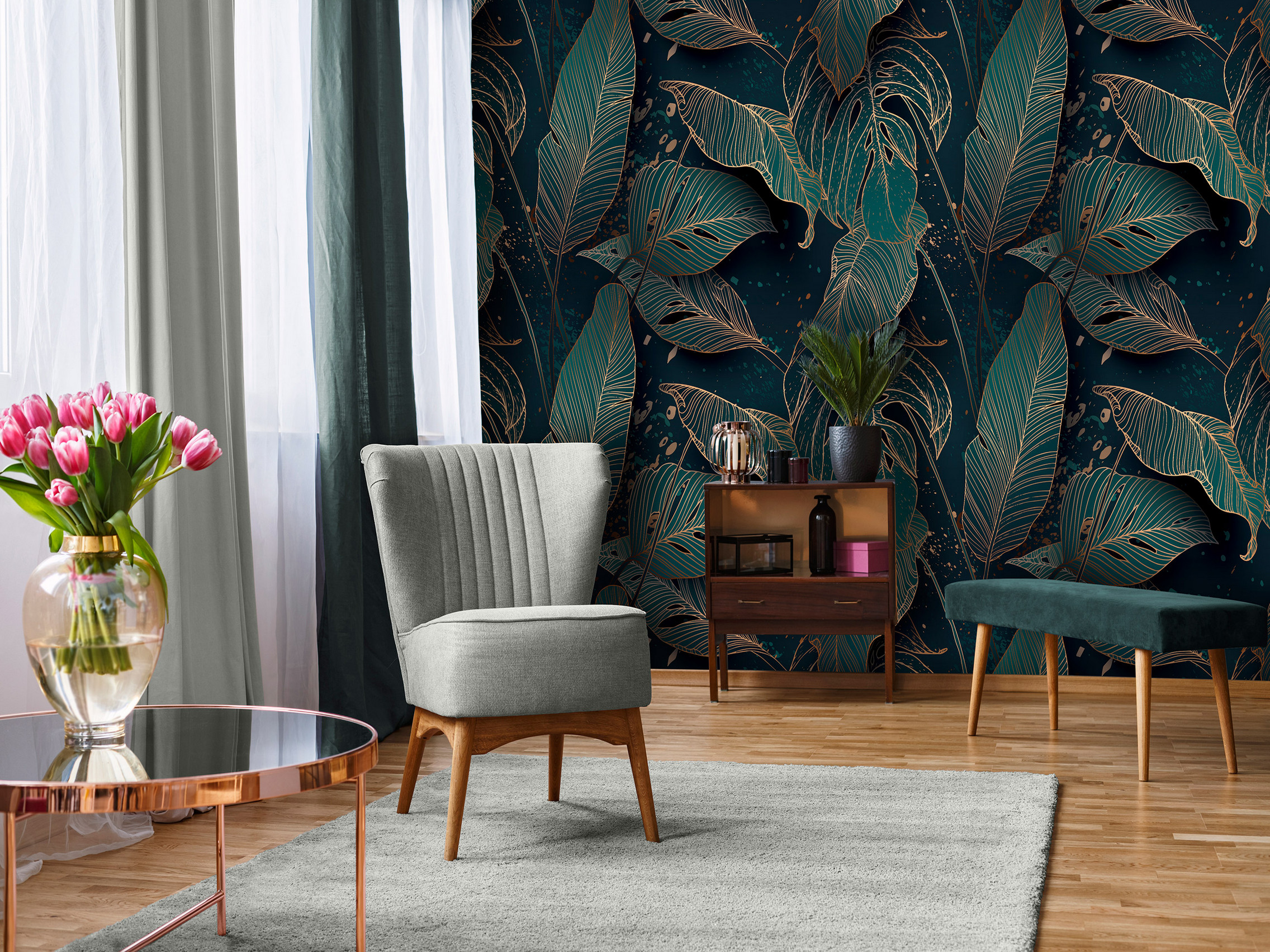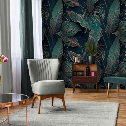 Modern elegancia, glamúros hangulat jellemzi a fotótapétát, melynek nagyméretű levélmintája 3d hatású grafikája szemet gyönyörködtető látványt nyújt.