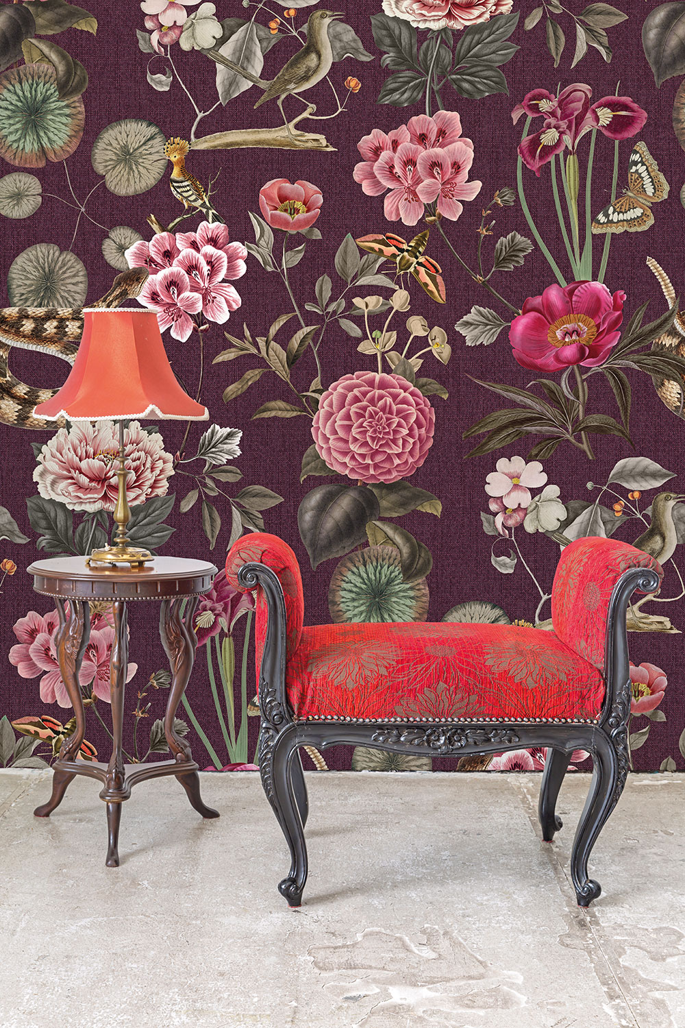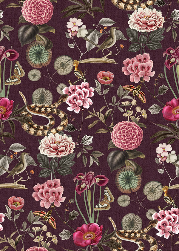 Sötét barnás vörös alapszínen jelennek meg a lila és rózsaszín egzotikus virágok, miközben kígyók és más állatok tekergőznek körülöttük. Érdekes, látványos minta, mely egyedi légkört teremt az enteriőrben. A fotótapéta sajátossága, hogy egymás mellé sorolható, így a minta illesztődik, és nagy felület tapétázására is alkalmas.