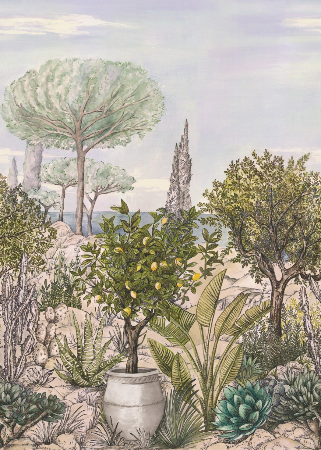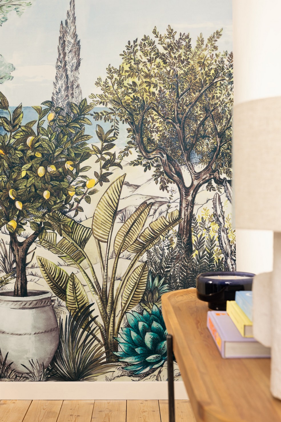 Caselio fotótapéta rajzolt mediterrán tájképpel, melynek visszafogott színei diszkrét dekorációt teremt otthonodban.