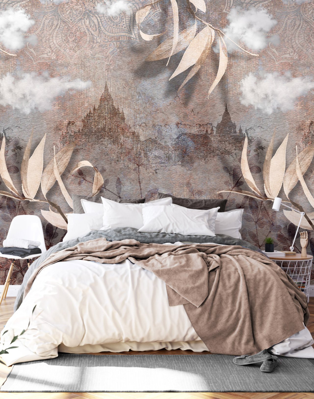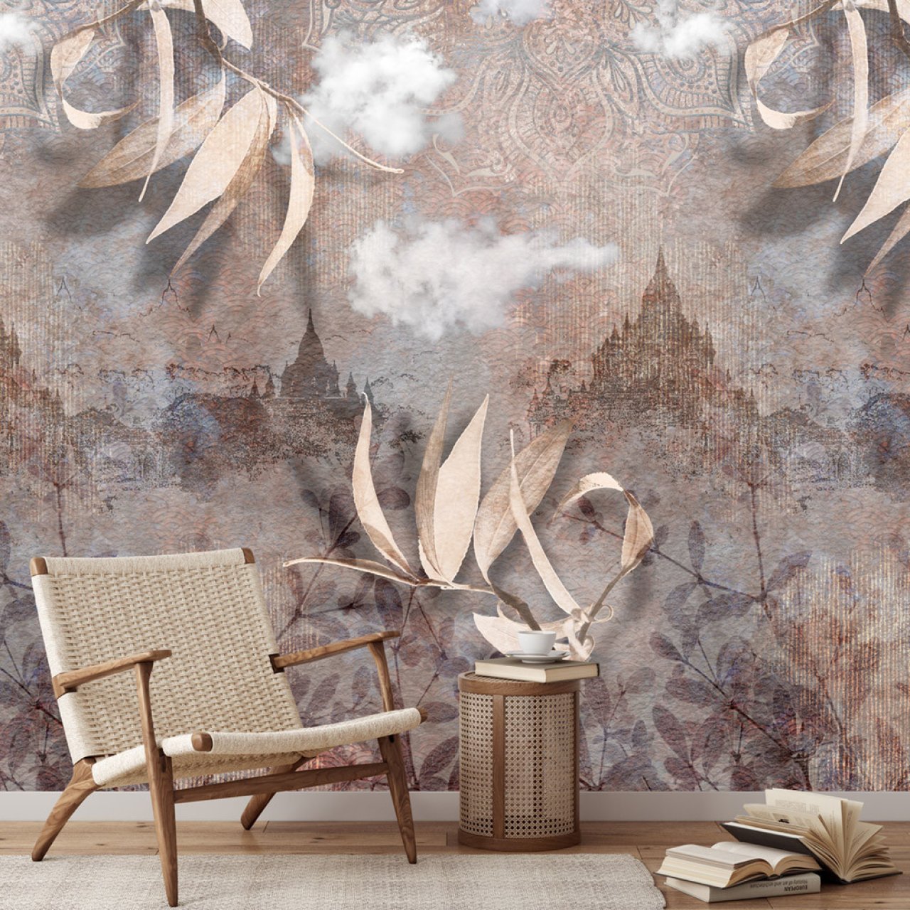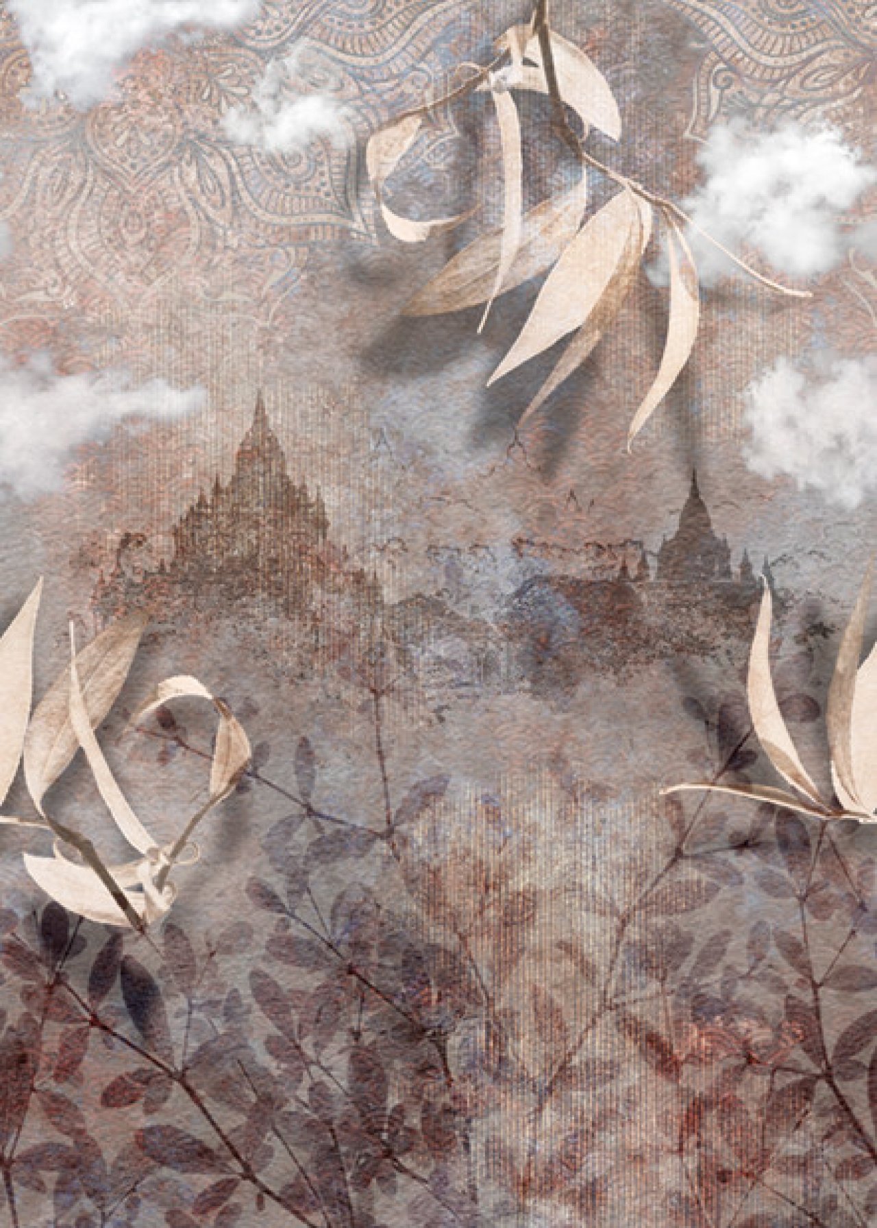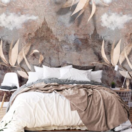 Design fotótapéta városi látképpel, melynek csodálatos kompozícióján a levelek, felületi minták és a háttérben felbukkanó székesegyház képe kombinálódik. Különleges fotótapéta, mely egyedi hangulatot teremt az enteriőrben.