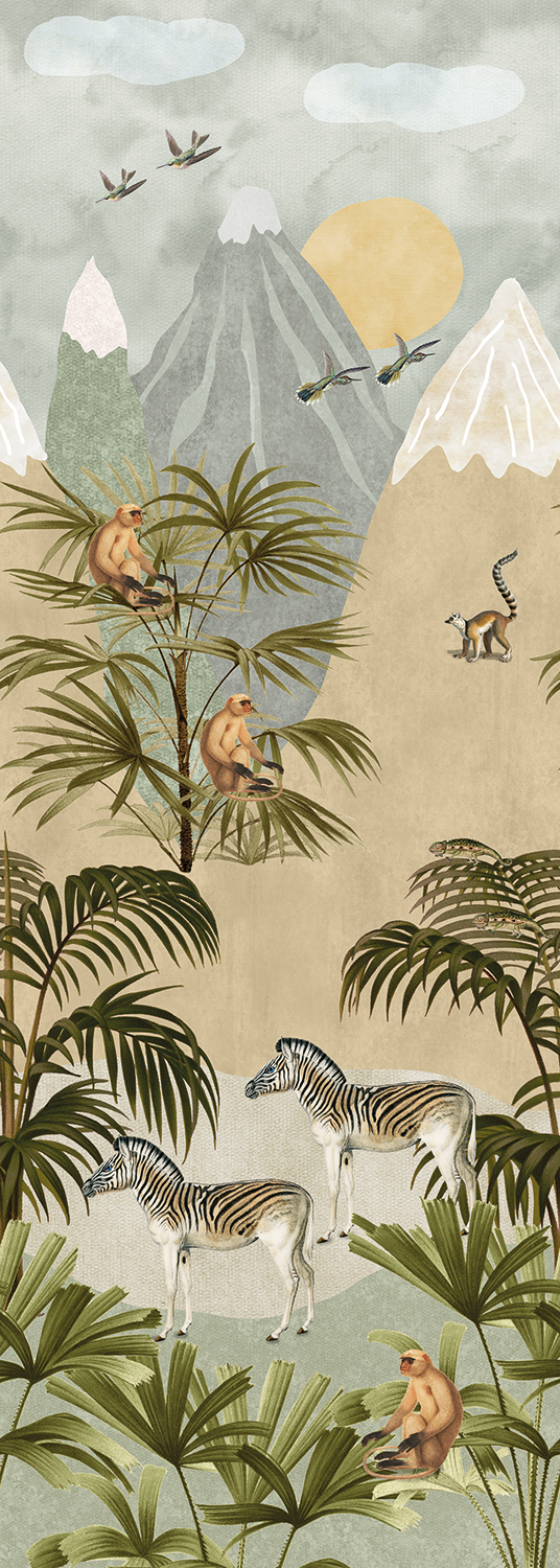 Hegyvidéki táj ötvöződik a dzsungelek pálmafáival a fotótapétán, melynek igazi hatása akkor érvényesül, ha több panelt helyezünk egymás mellé. Az állatokkal kiegészített tájkép tökéletes háttér dekoráció fiatalok számára.