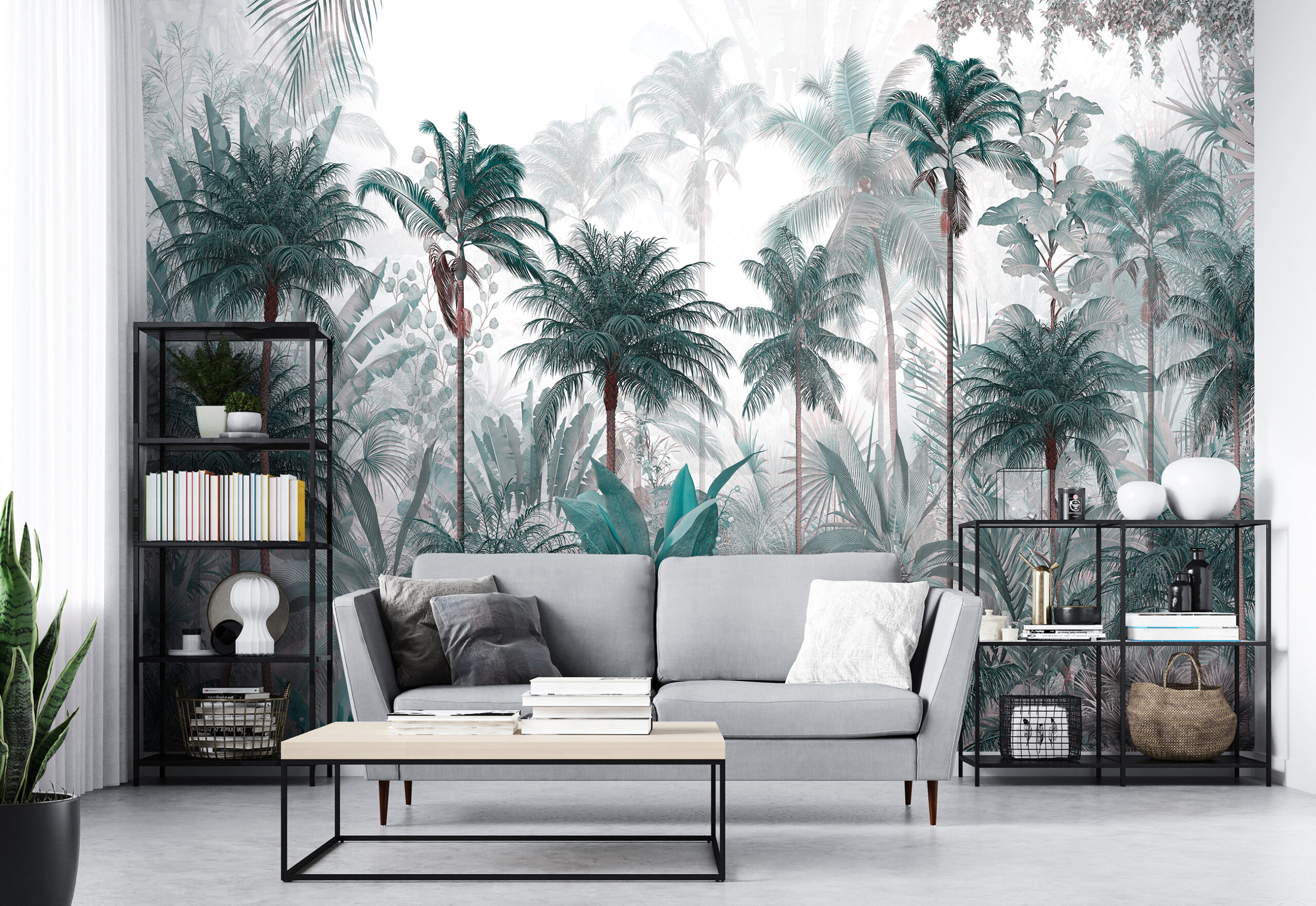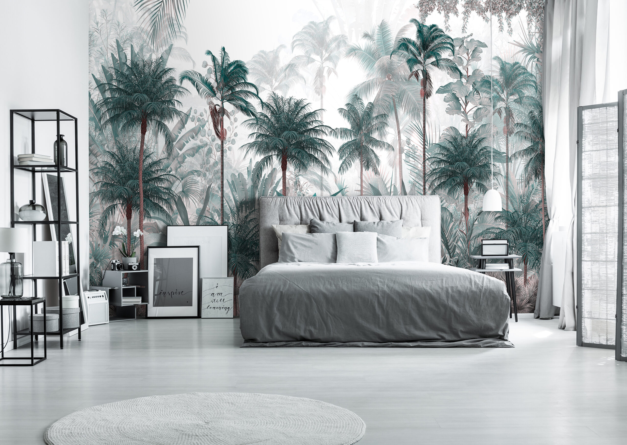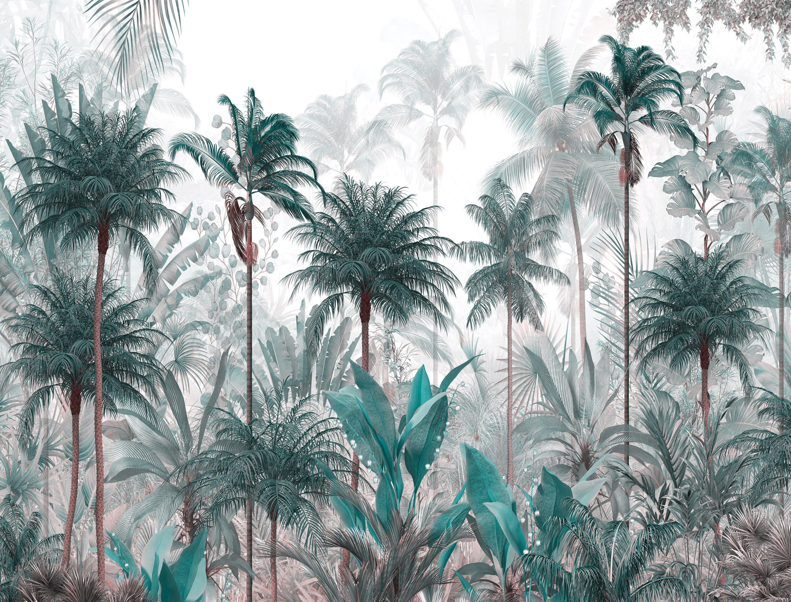 Egzotikus fotótapéta pálmafákkal, melynek gyönyörű, türkizkékes színárnyalata egyedi külsőt kölcsönöz az enteriőrnek.