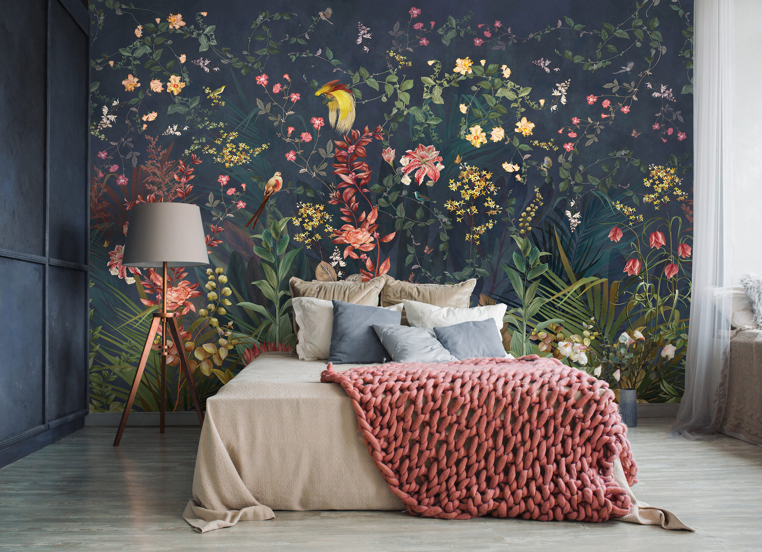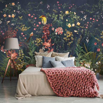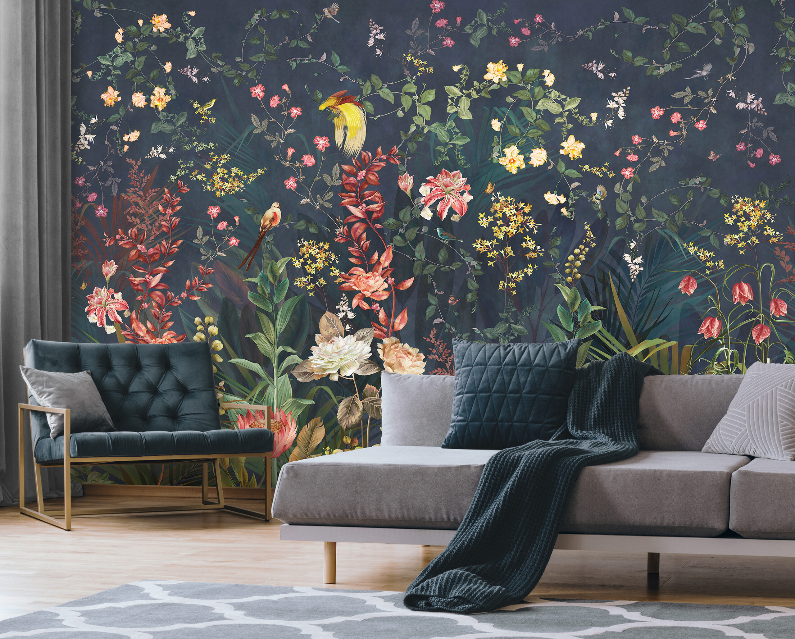 Egzotikus hangulatú fotótapéta színes virágokkal és madarakkal, melynek sötét alapszíne drámai külsőt kölcsönöz.