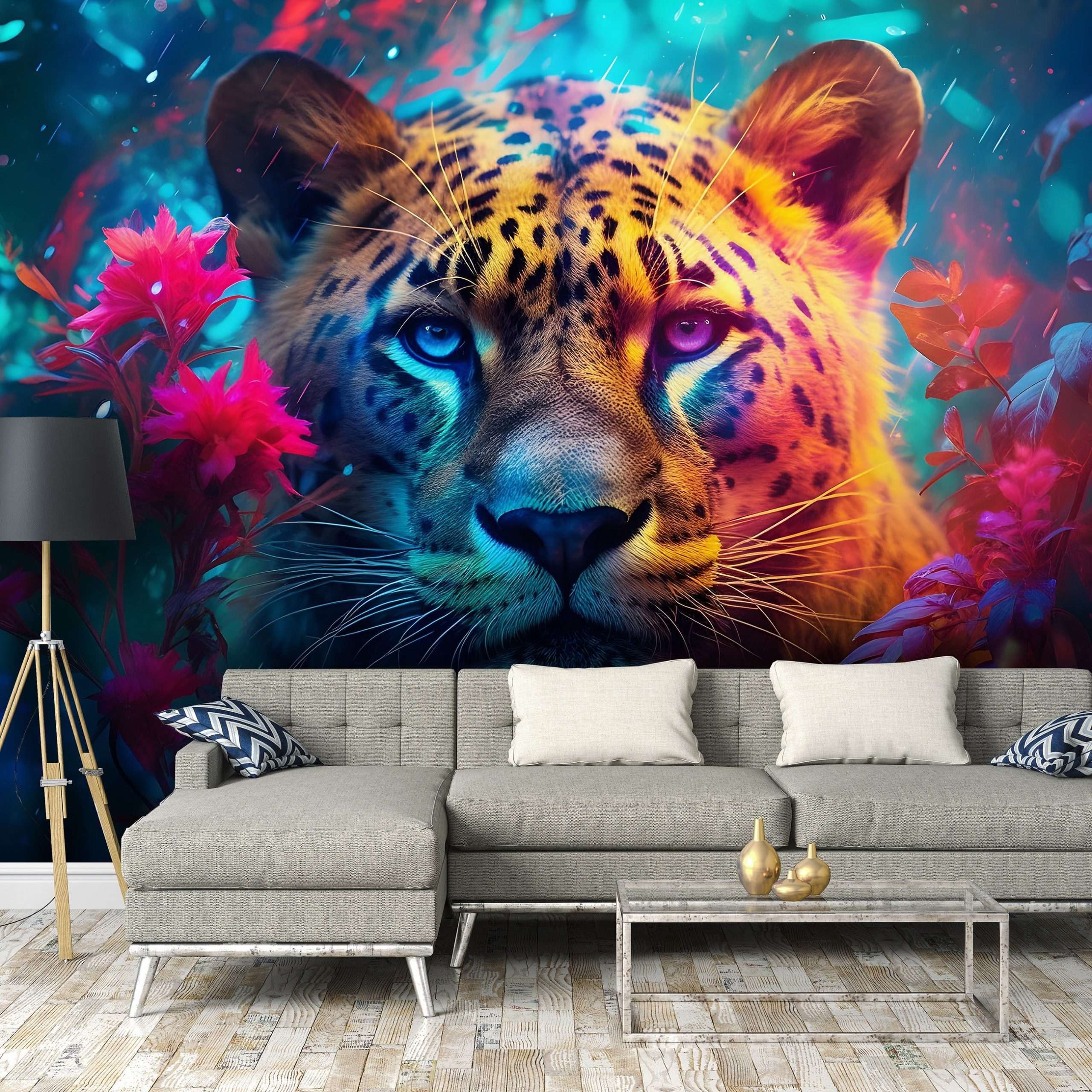 Élénk, erőteljes színekben pompázó fotótapéta, melyen a fenséges leopárd egzotikus látványt nyújt.