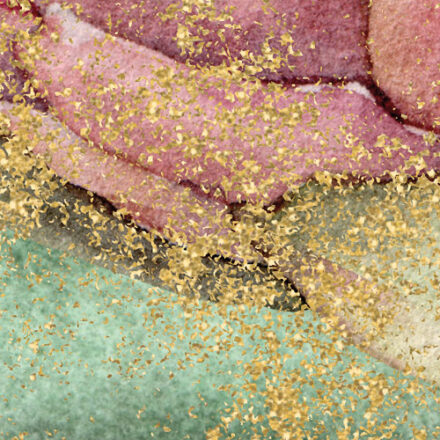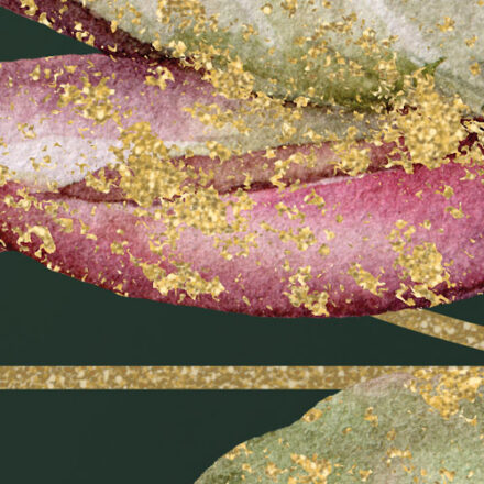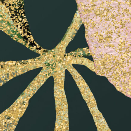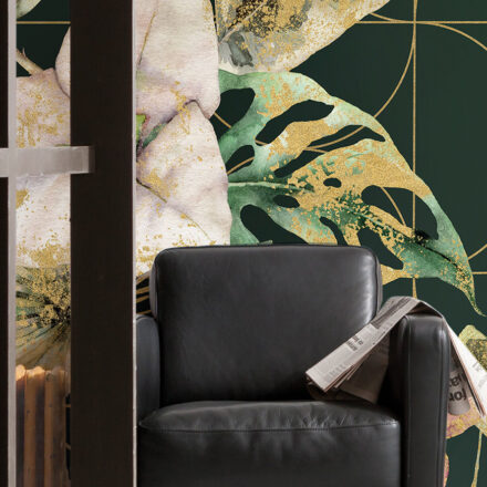 Egzotikus, luxus hatást keltő fotótapéta, melynek smaragdzöld hátterén aranyszínnel rajzolódik ki a geometriai minták és virágok tökéletes kompozíciója.