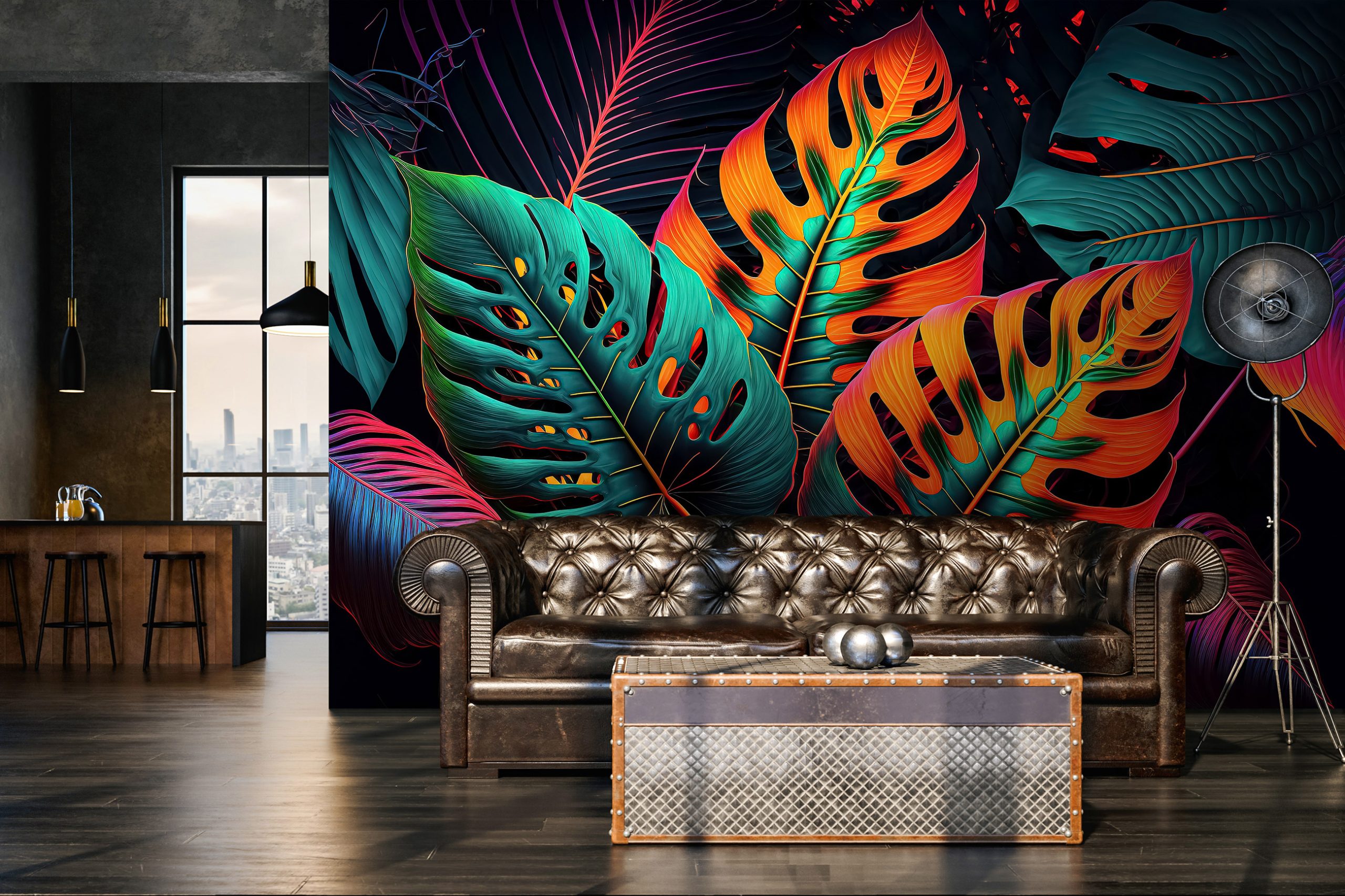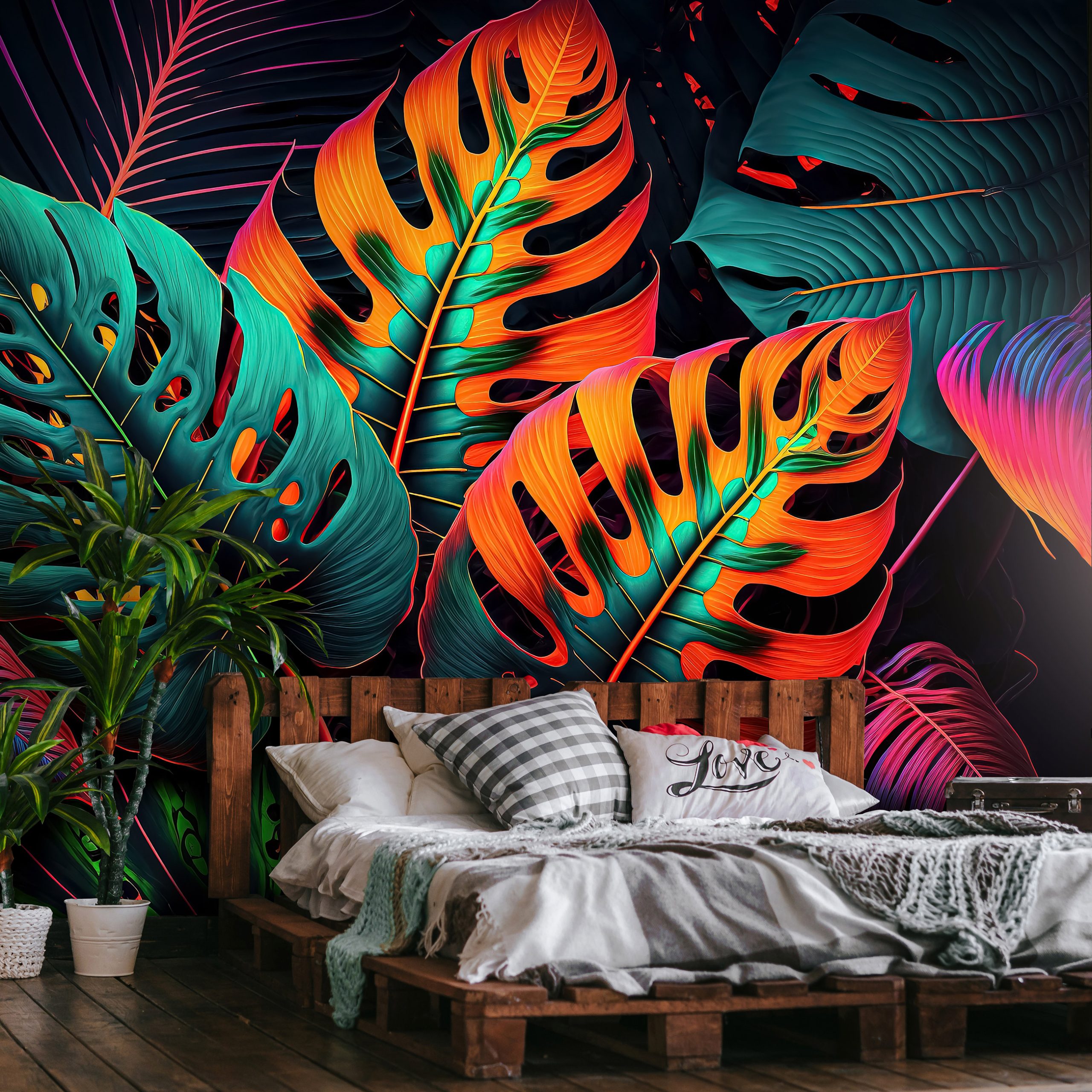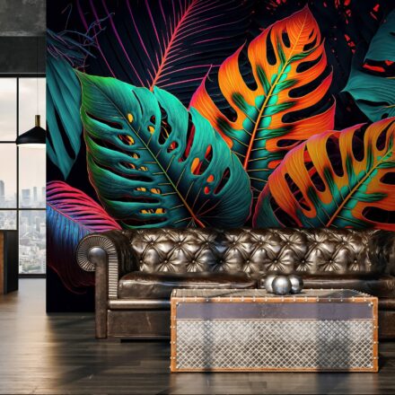 Tüzes, glamúros hangulat árad a fotótapétából, melynek egzotikus pálmalevelei neon színekkel emelkednek ki. A maximalizmus stílusa inspirálta a fotótapétát, melynek egzotikuma átformálja az enteriőr hangulatát.
