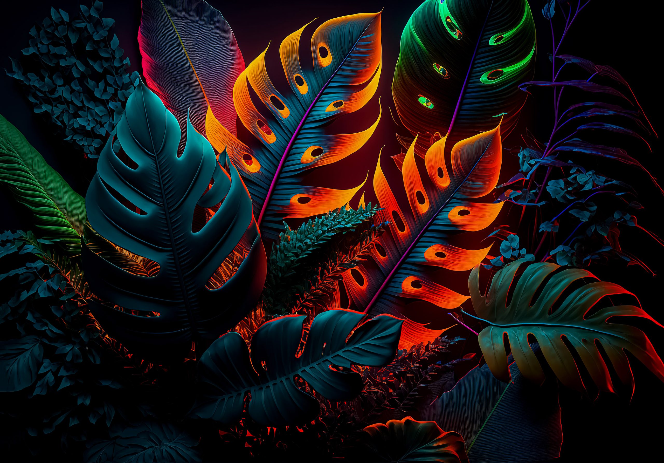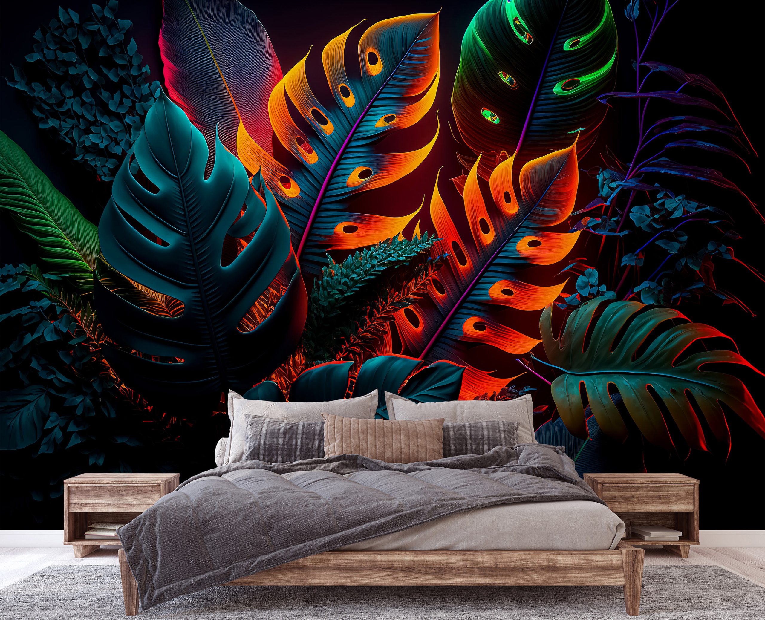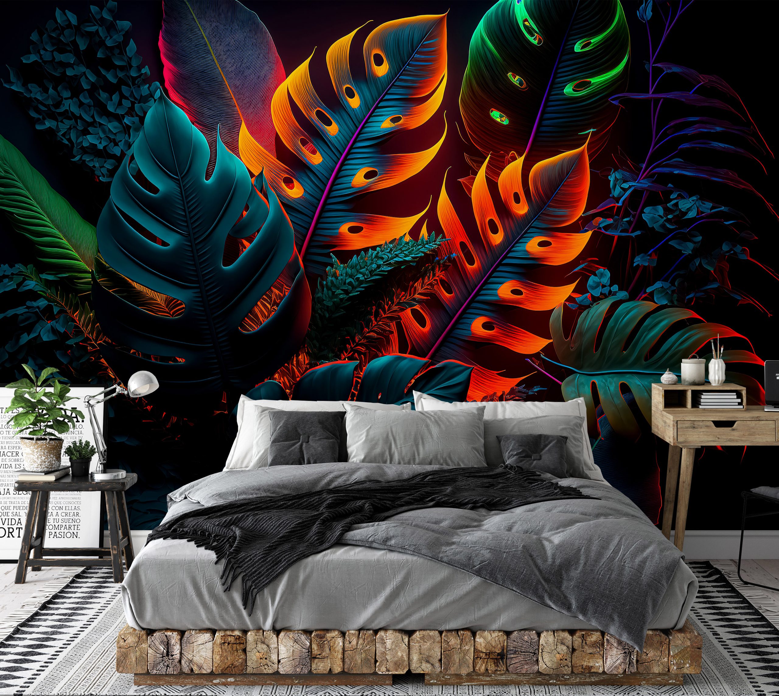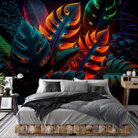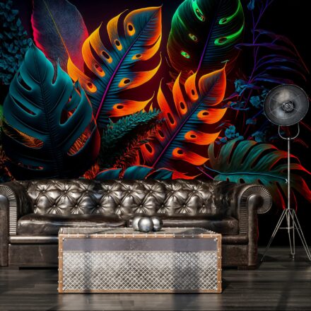 Tüzes, glamúros hangulat árad a fotótapétából, melynek egzotikus pálmalevelei neon színekkel emelkednek ki. A maximalizmus stílusa inspirálta a fotótapétát, melynek egzotikuma átformálja az enteriőr hangulatát.