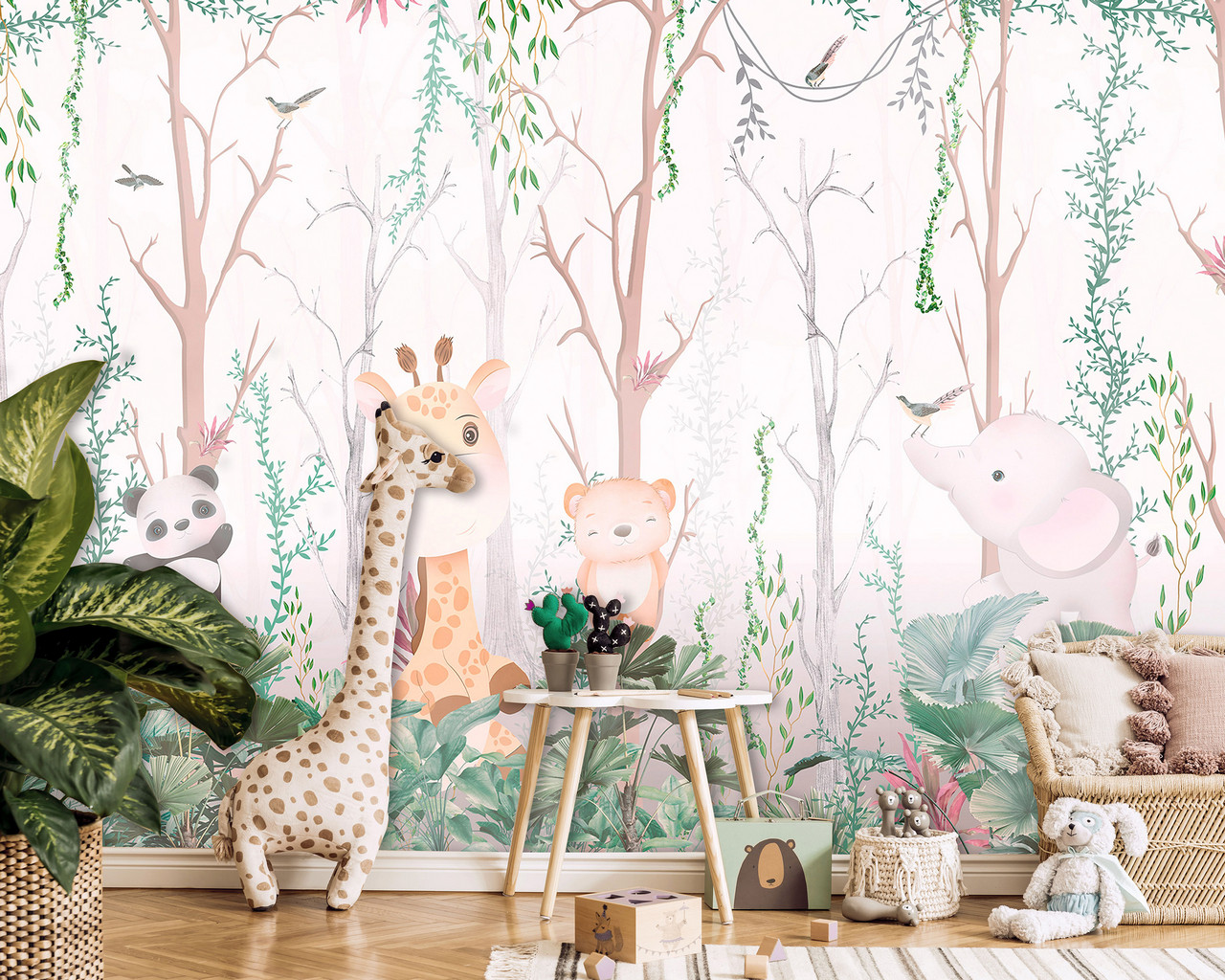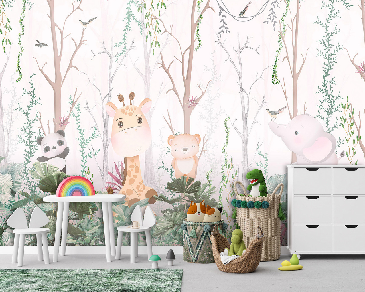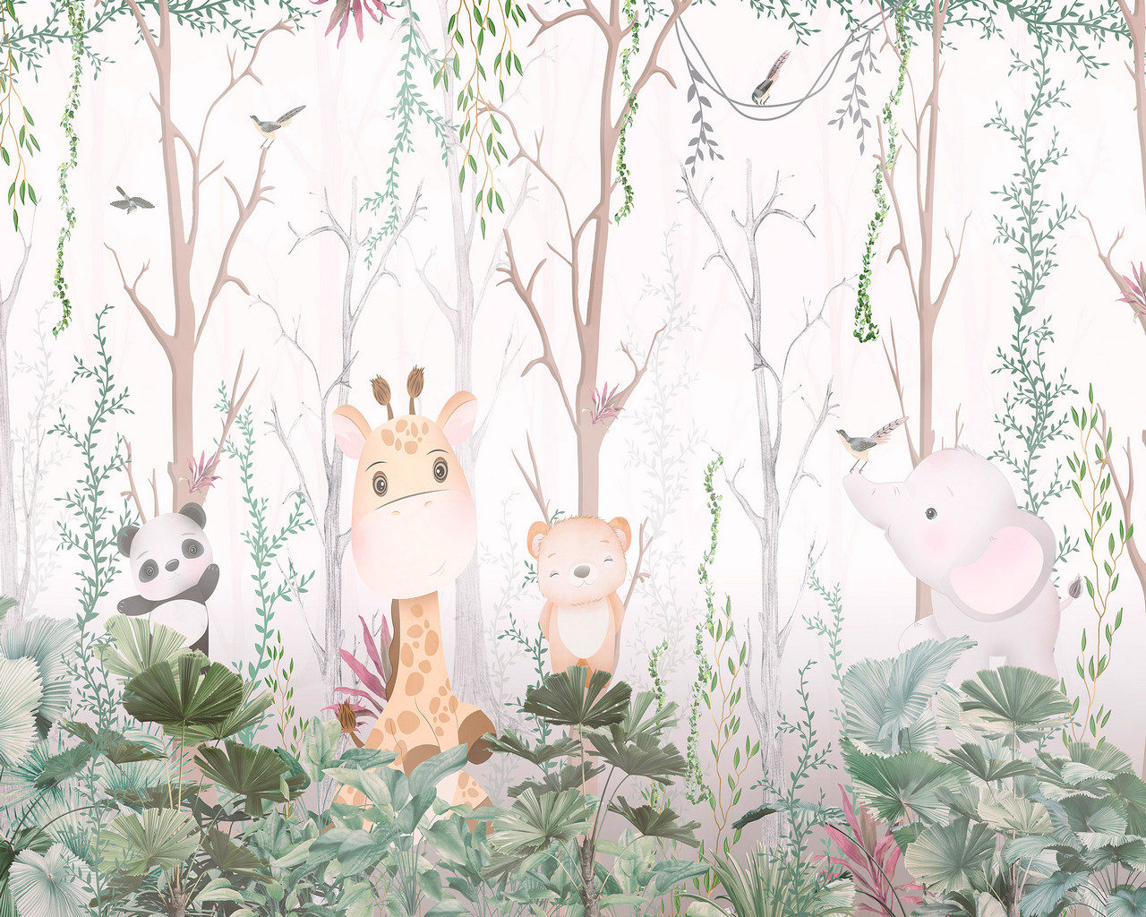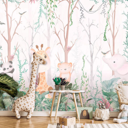 Vidám állatok kandikálnak ki a fák és erdei növényzet közül, hogy boldog mosolyt csaljanak a szoba kis lakójának arcára. A plüssfigurákra emlékeztető állatrajzok barátságos atmoszférát teremtenek a gyerekszobában.