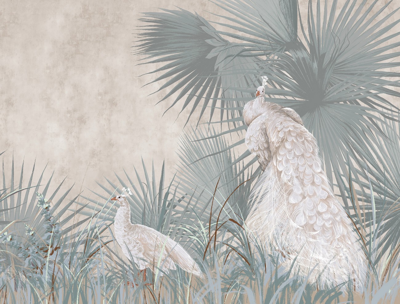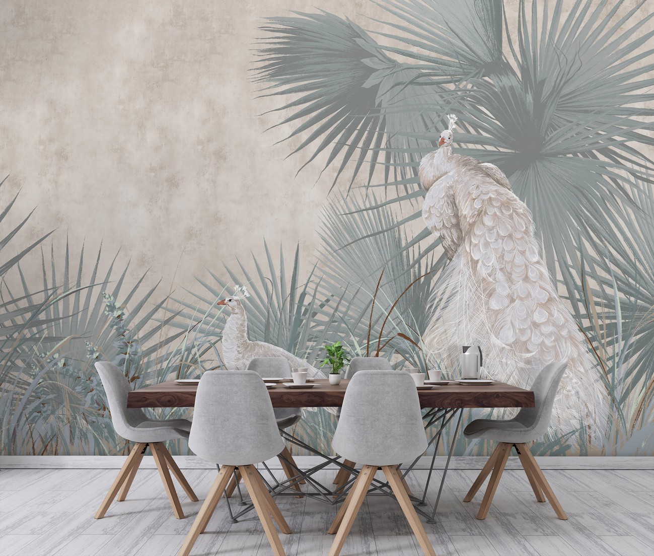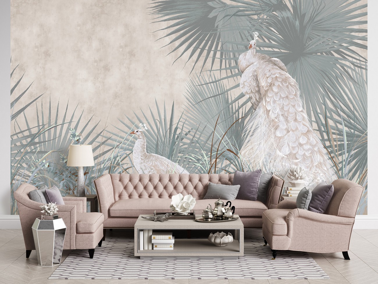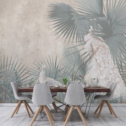 Elegáns fotótapéta fehér pávamadárral, mely a nőies eleganciát és a pálmalevelekből áradó egzotikumot egyesíti és teremt különleges hangulatot otthonodban.