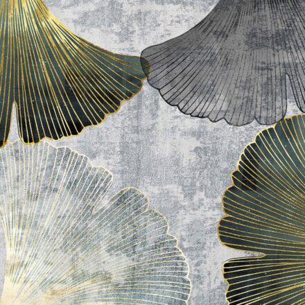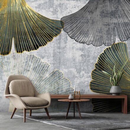 Elegáns fotótapéta ginkgo biloba levelekkel, melyen a nagy méretű levelek szürke és sárga vonalakkal rajzolódnak ki. A fotó képe egy koptatott falfelület imitációja, fotója.