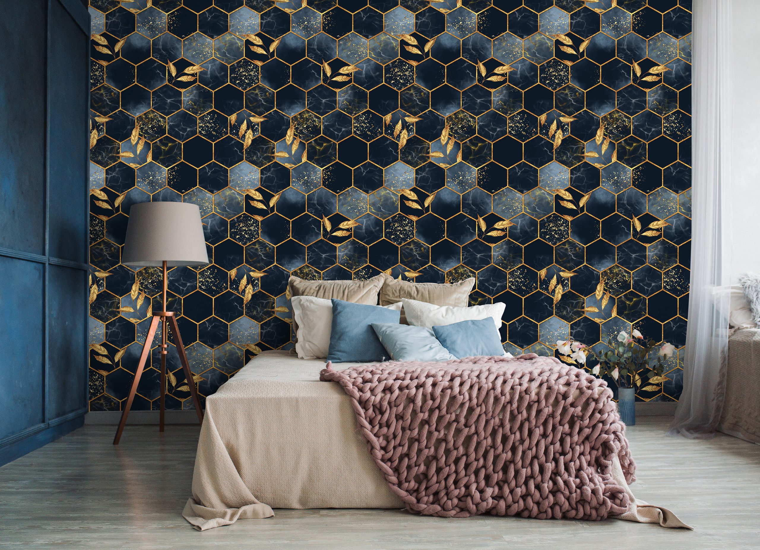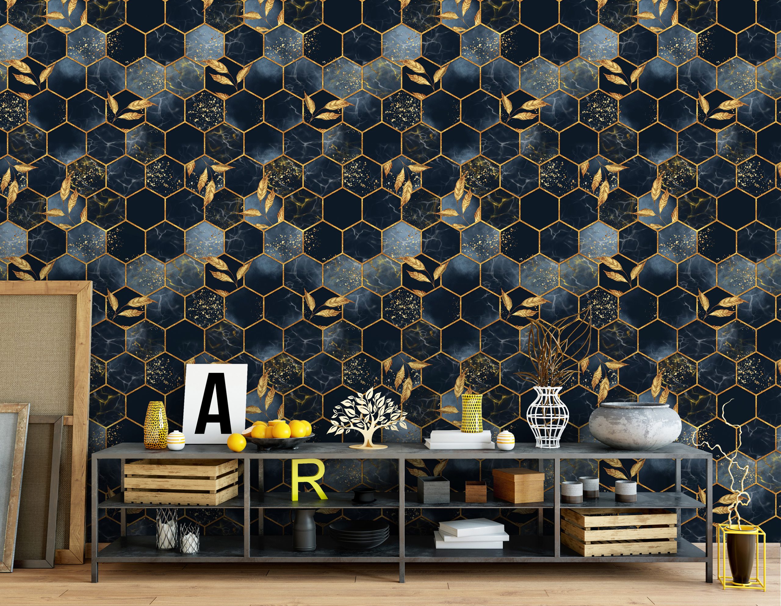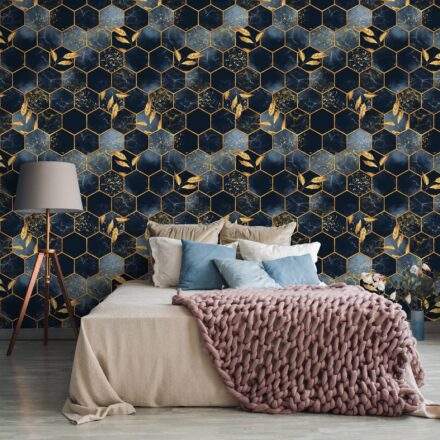 Trendi fotótapéta, melynek kompozícióját a modern geometriai minta és az elegáns levelek kombinációja alkotja.