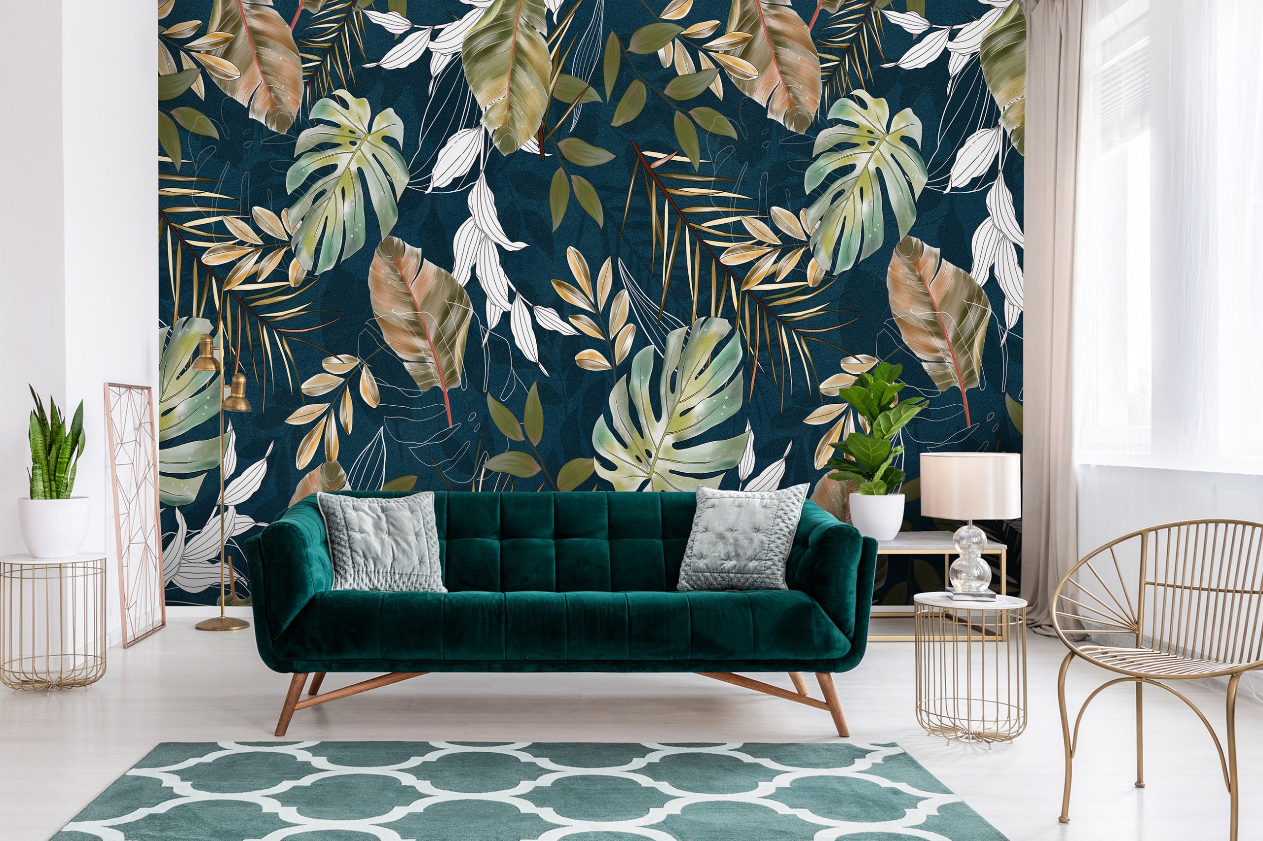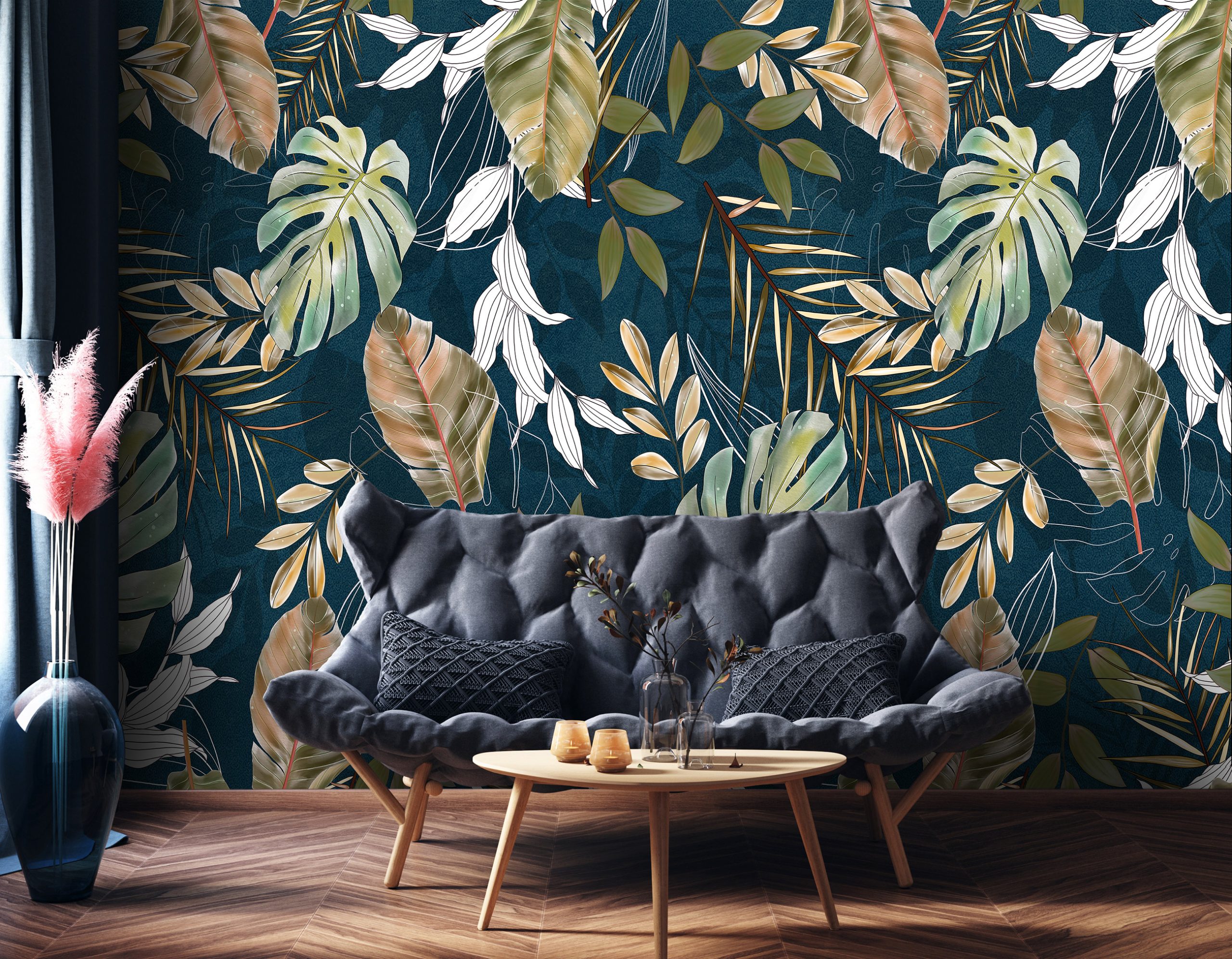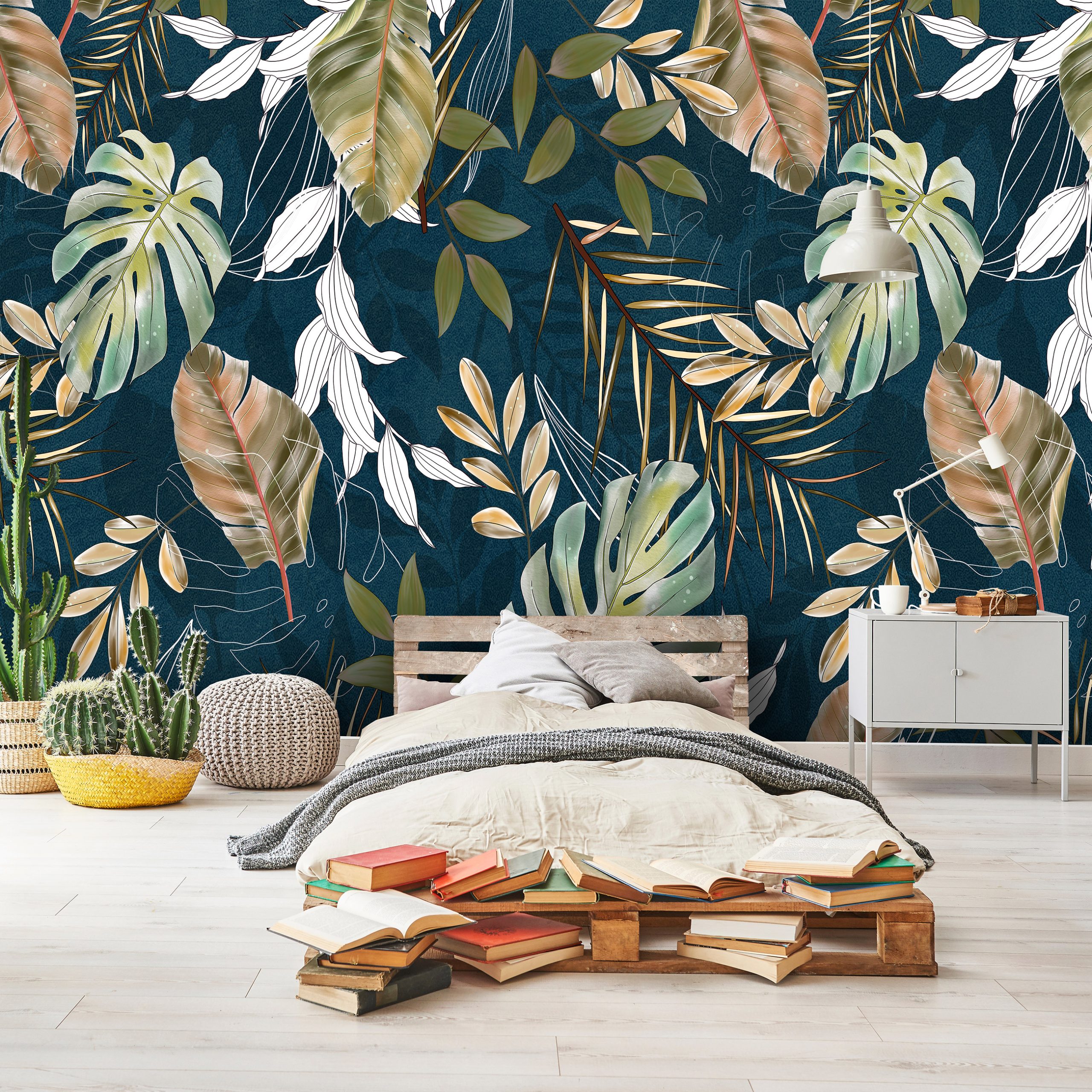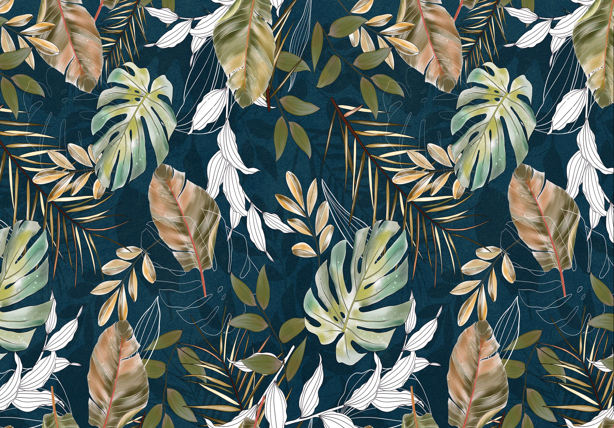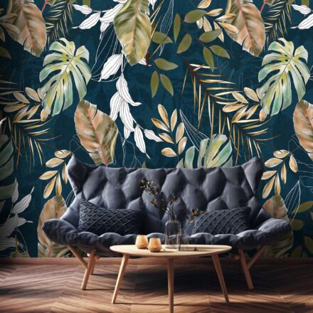 Elegáns levélmintás tapéta egy csipetnyi egzotikummal fűszerezve. Gyönyörű színkombináció a sötét alapon megjelenő színes levélmintával.