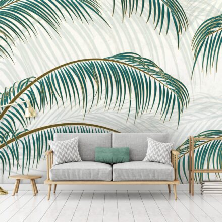 Trópusi pálmalevelek dekorálják a tapétát, melynek könnyed formája eleganciát tükröz.