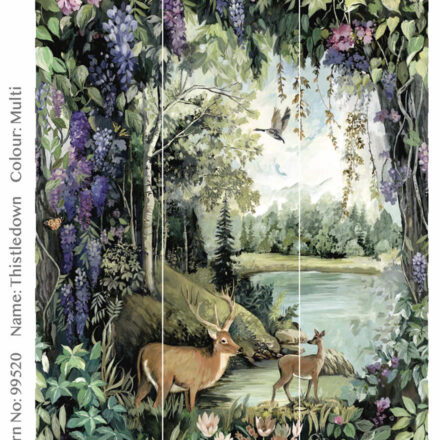 A Holden Tales of the Manor kollekció egyik legelbűvölőbb darabja ez a festett hatású erdei tájképes fotótapéta, amely egy nyugodt tóparti jelenetet ábrázol, kecses szarvasokkal és virágzó növényzettel. A részletgazdag ecsetvonások és a lágy, természetes színek valódi festményhatást keltenek, miközben meleg, nyugodt atmoszférát teremtenek a térben.