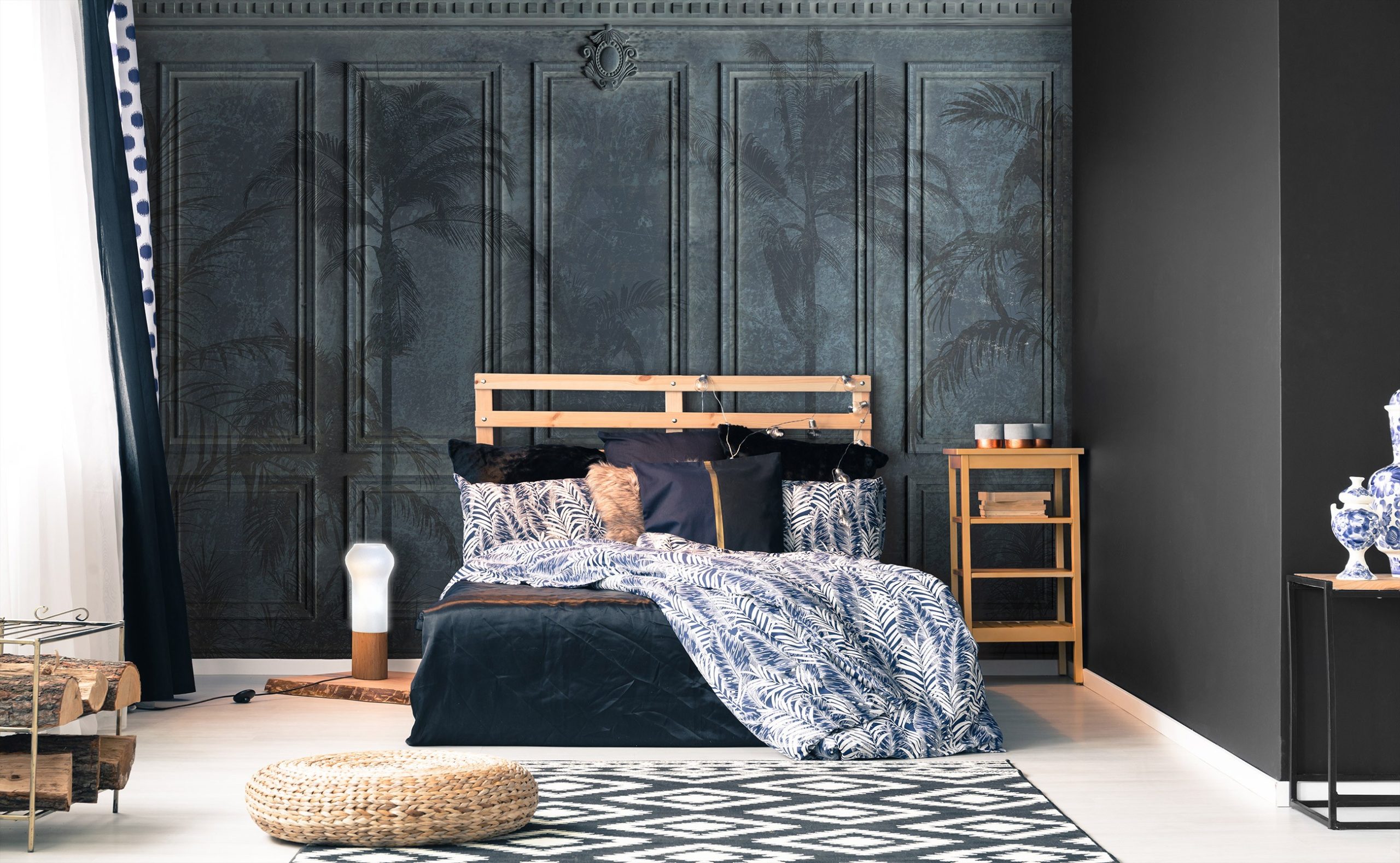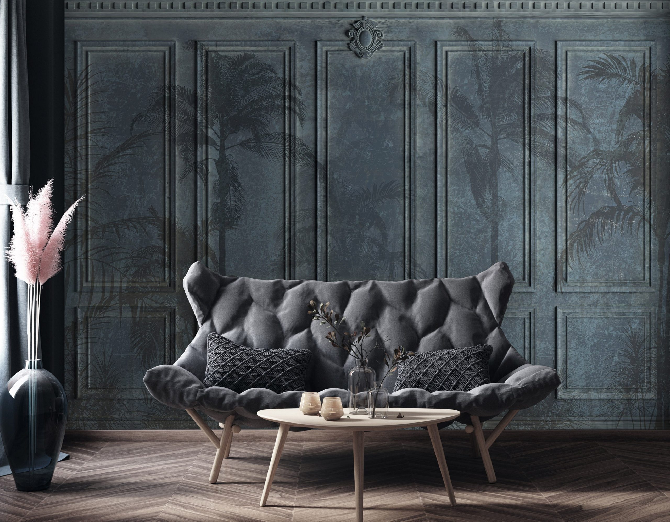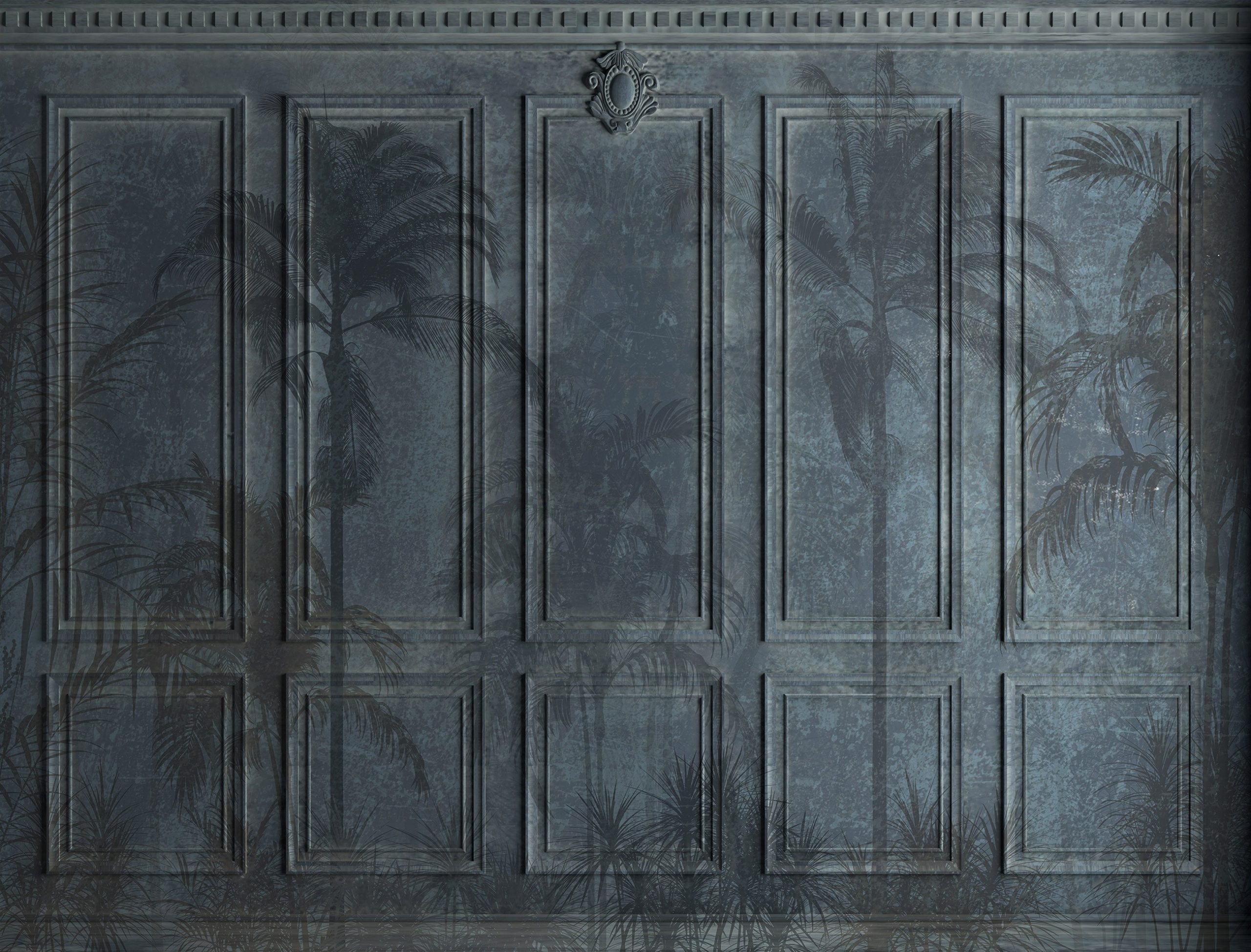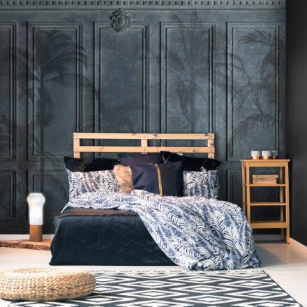 Klasszikus falburkolatot ábrázoló fotótapéta. A tapéta sima felülettel rendelkezik, melyen a falburkolaton kívül pálmafák is megjelennek. Különleges atmoszférát teremt az enteriőrben.