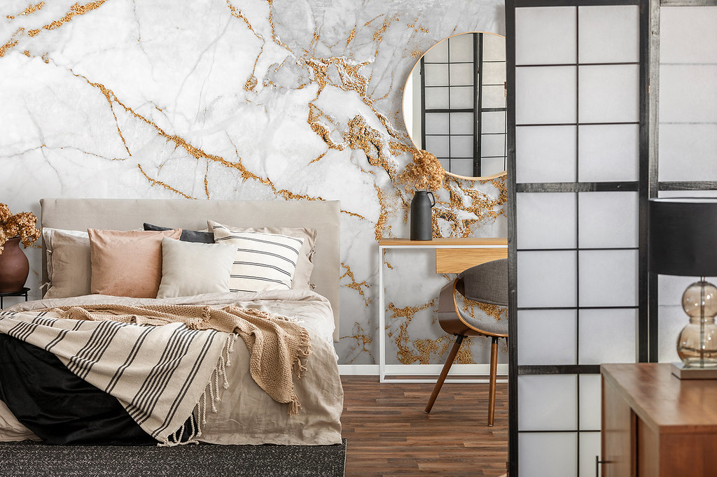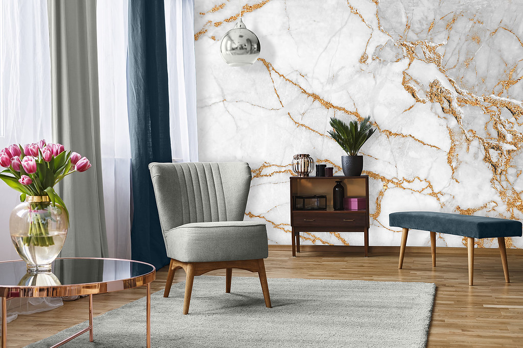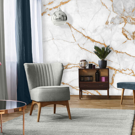 Márvány felületet imitáló fotótapéta, melynek arany erezete glamúros hangulatot kölcsönöz. A fotótapéta vlies anyaga sima felülettel rendelkezik, melyet digitálisan nyomtattak a tökéletes hatás elérése érdekében.