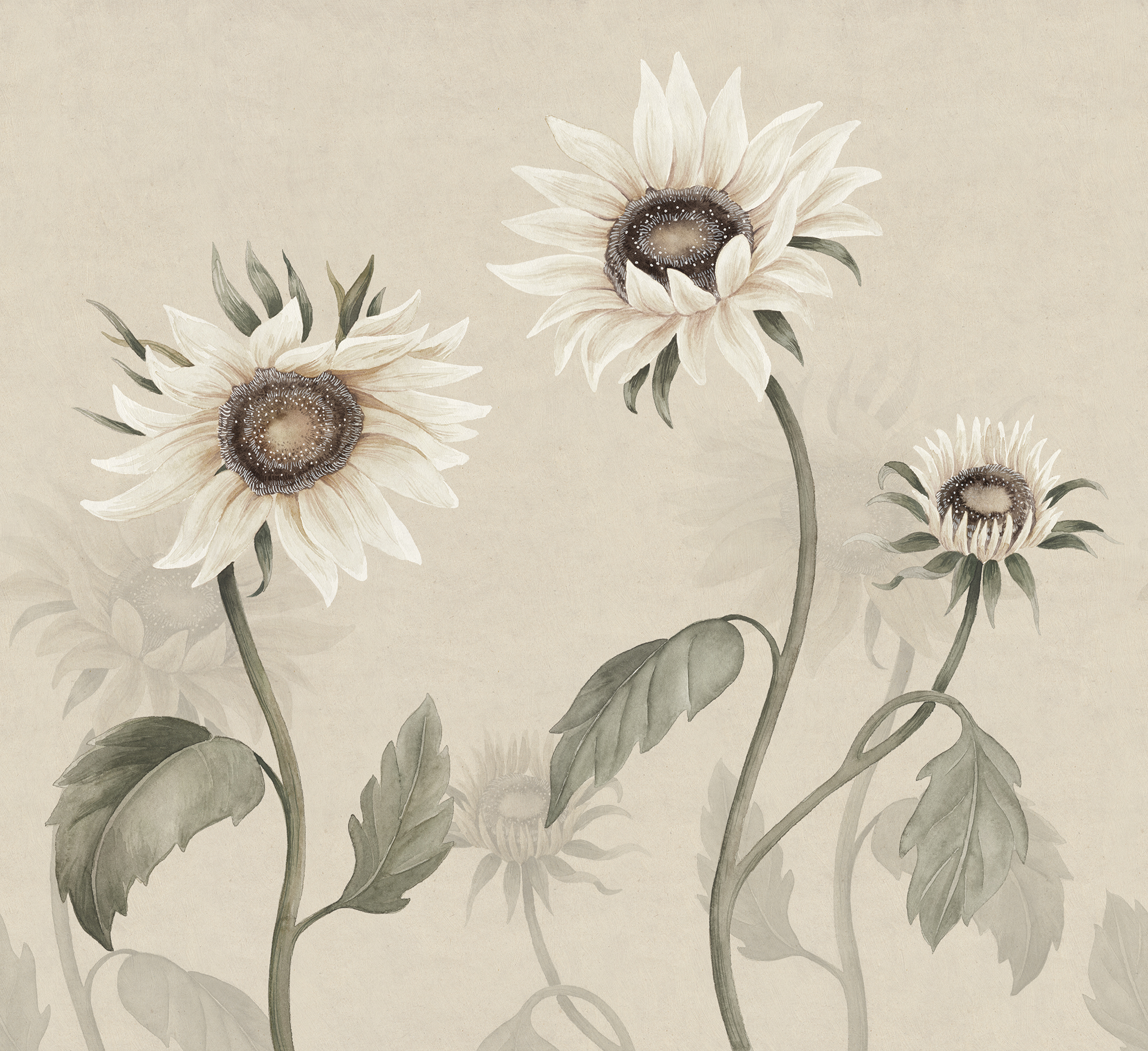 A finoman festett napraforgók lágy, akvarell hatású részletekkel jelennek meg, a kompozíció nem tolakodó, mégis karakteres.