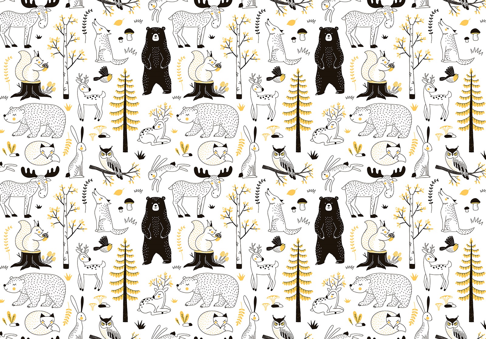 Kedvenc erdei állataink (nyuszi, róka, őz, medve, mókus) jelenik meg modern fekete fehér színekben. A monokróm színeket felvidítják a sárga szín, mely a fák leveleit díszítik.