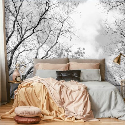 Trendi fekete-fehér fotótapéta, melyen fák látványos képet alkotnak.