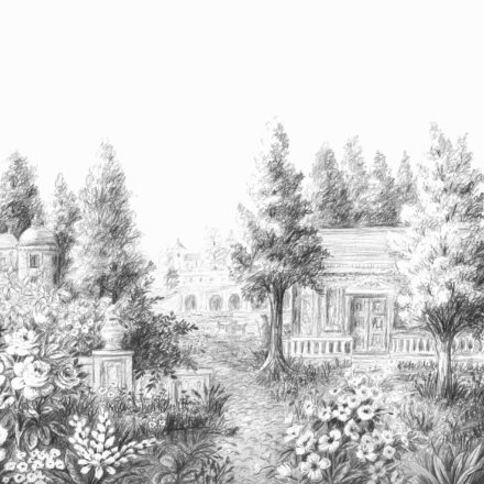 Hangulatos vidéki uradalom képe tárul elénk modern fekete-fehér színváltozatban. A házat gyönyörű virágos kert veszi körül, idilli tájat teremtve.