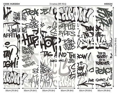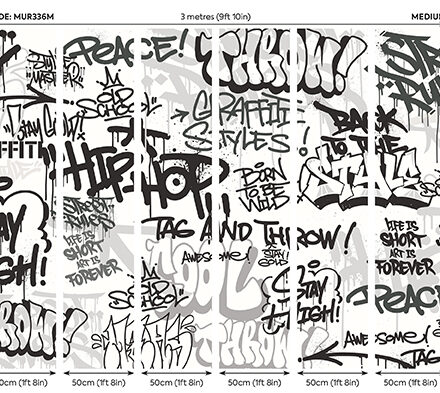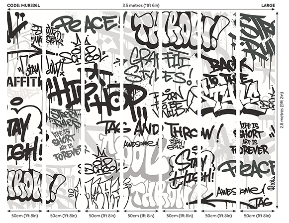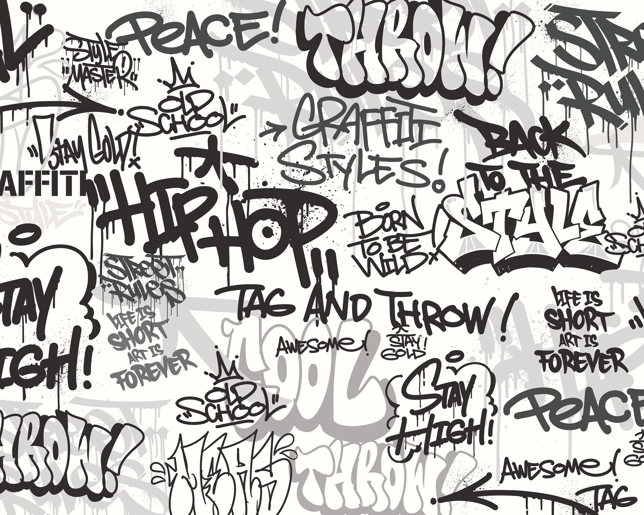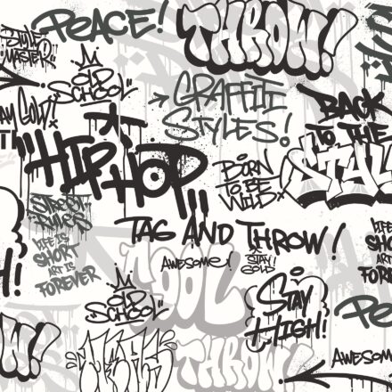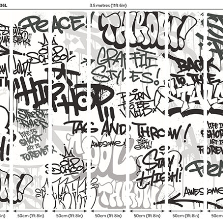 Fekete – fehér graffiti mintás fotótapéta, melyet vagány fiatalok szobájának dekorálására ajánlunk.