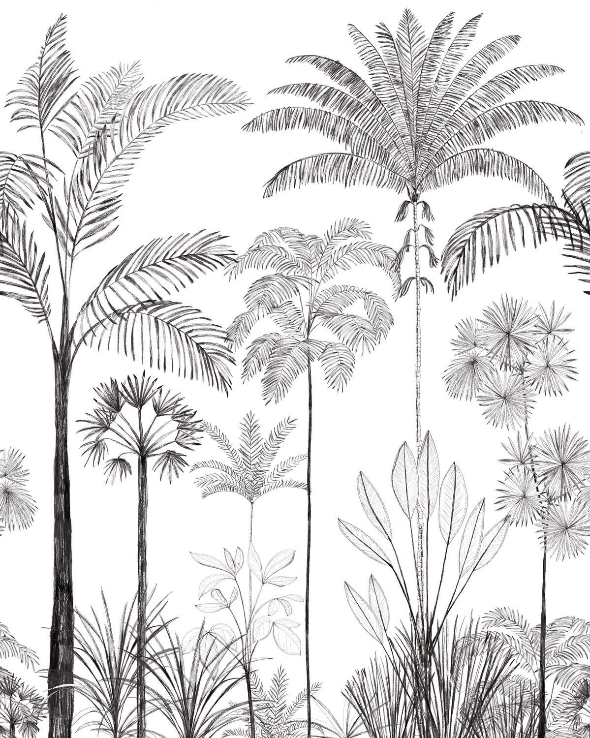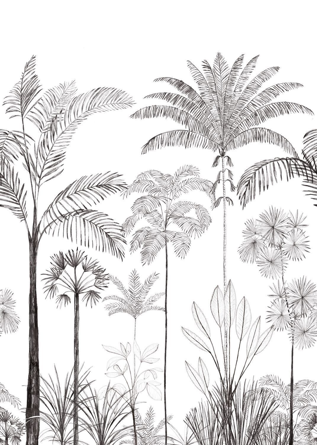 Fekete – fehér pálmafa mintás fotótapéta, melynek trendi mintája különlegessé varázsolja az enteriőrt.