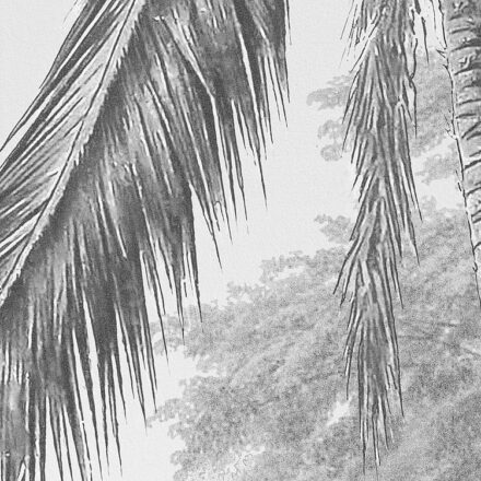 Nyugalmat közvetít a fekete-fehér pálmaleveles fotótapéta, ahol a pálmafák idilli tavat vesz körül.