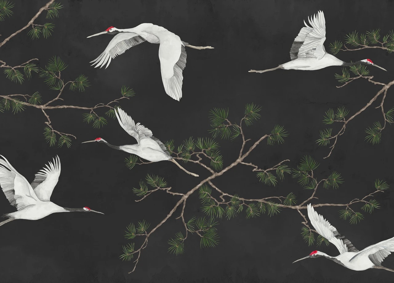 Fekete orientális stílusú fotótapéta kecses darumadarakkal, mely légies eleganciával idézi meg a természet nyugalmát: szelíden szálló darvak tűnnek fel egy álomszerű égbolt alatt, finoman kidolgozott fenyőágak ölelésében. Bensőséges, megnyugtató hangulatot teremtenek, miközben a hófehér darvak, valamint a zöldesbarna ágrészletek életre keltik a japán tájak varázsát.