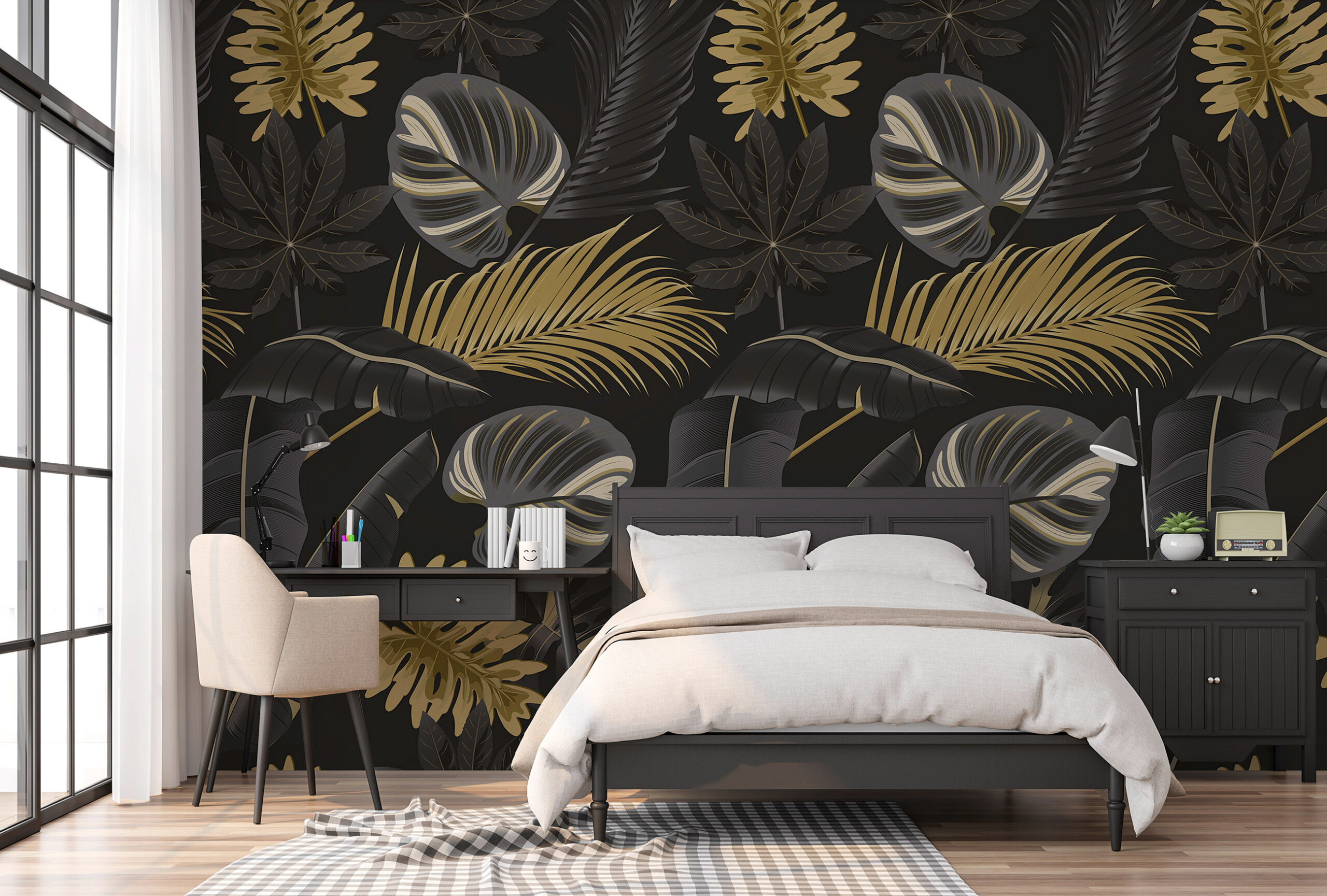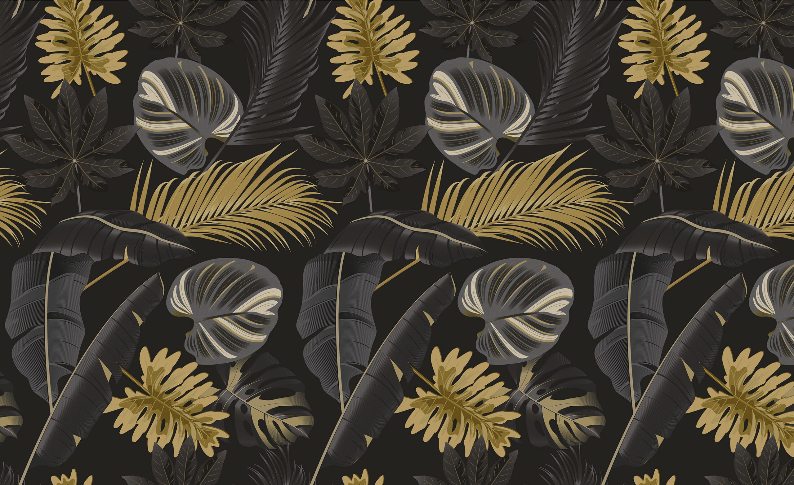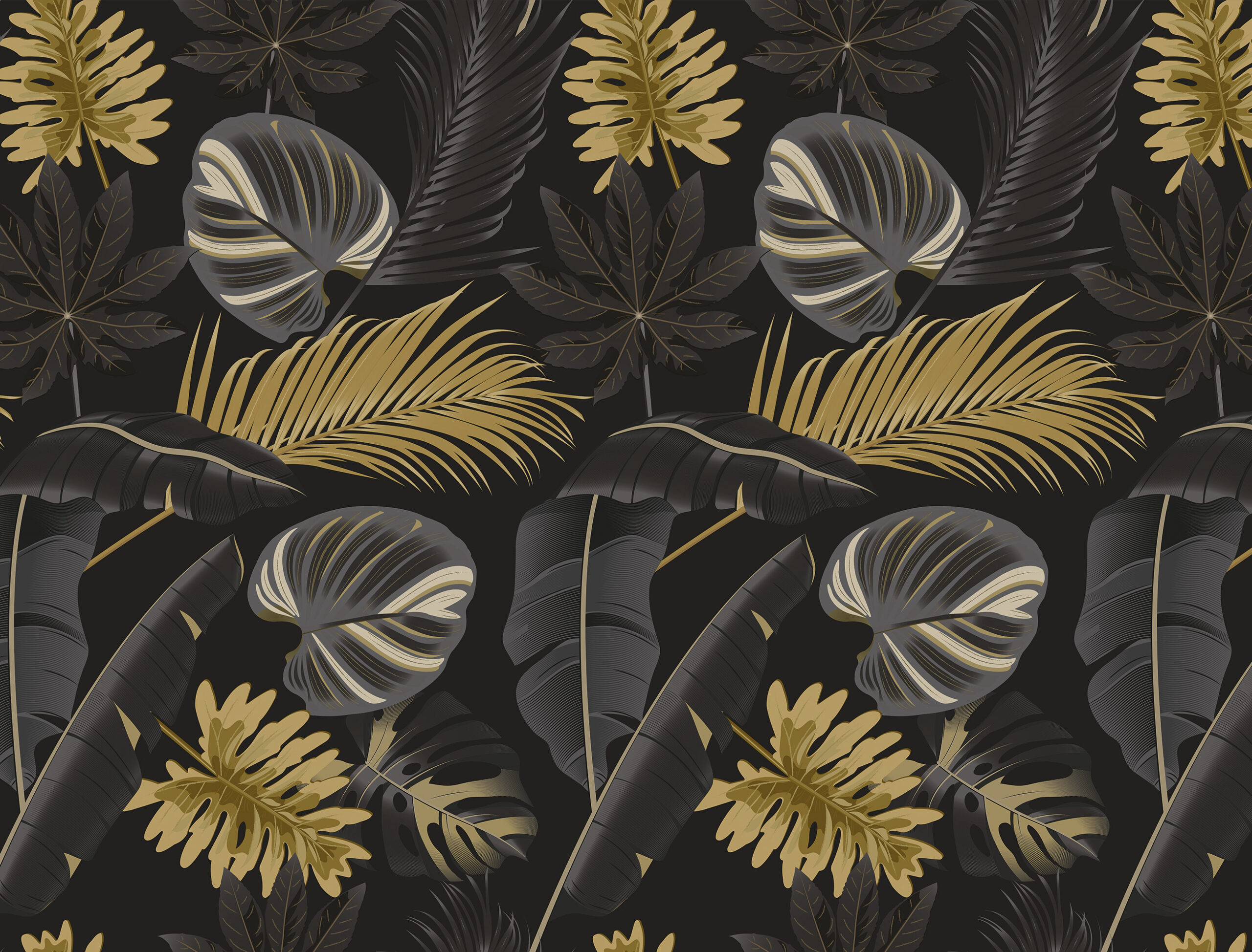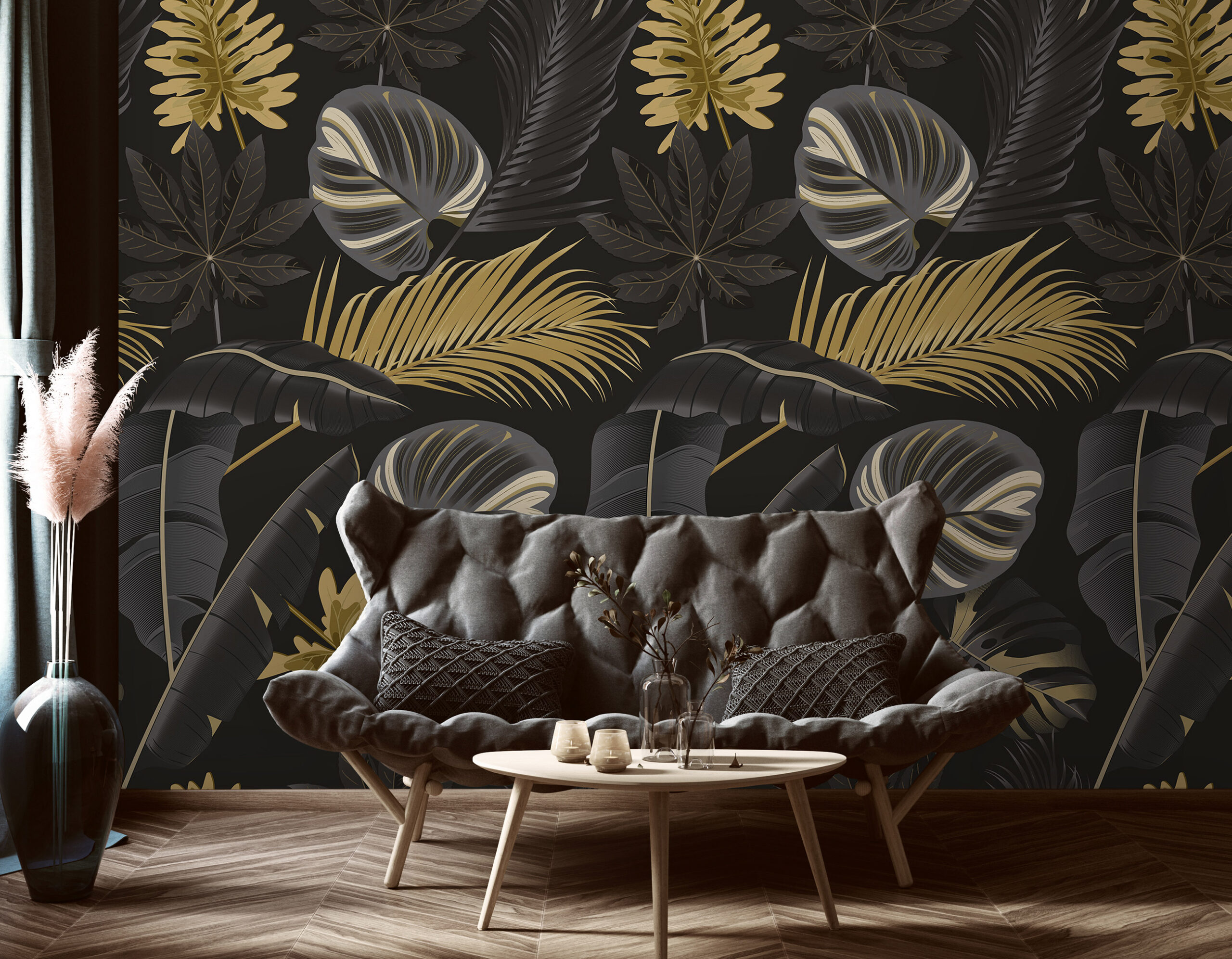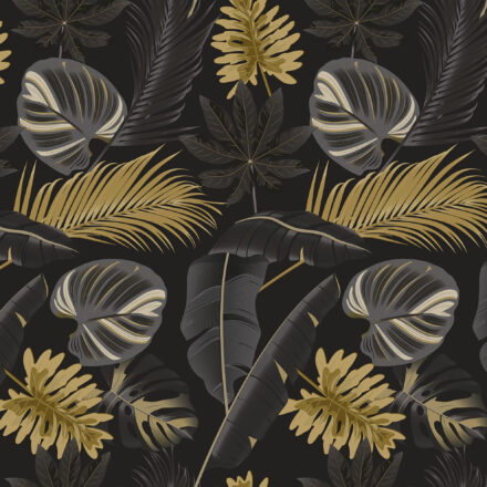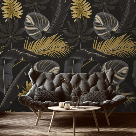 Fekete – sárga trópusi levélmintás fotótapéta, mely látványosan dekorálja otthonod helyiségeit.