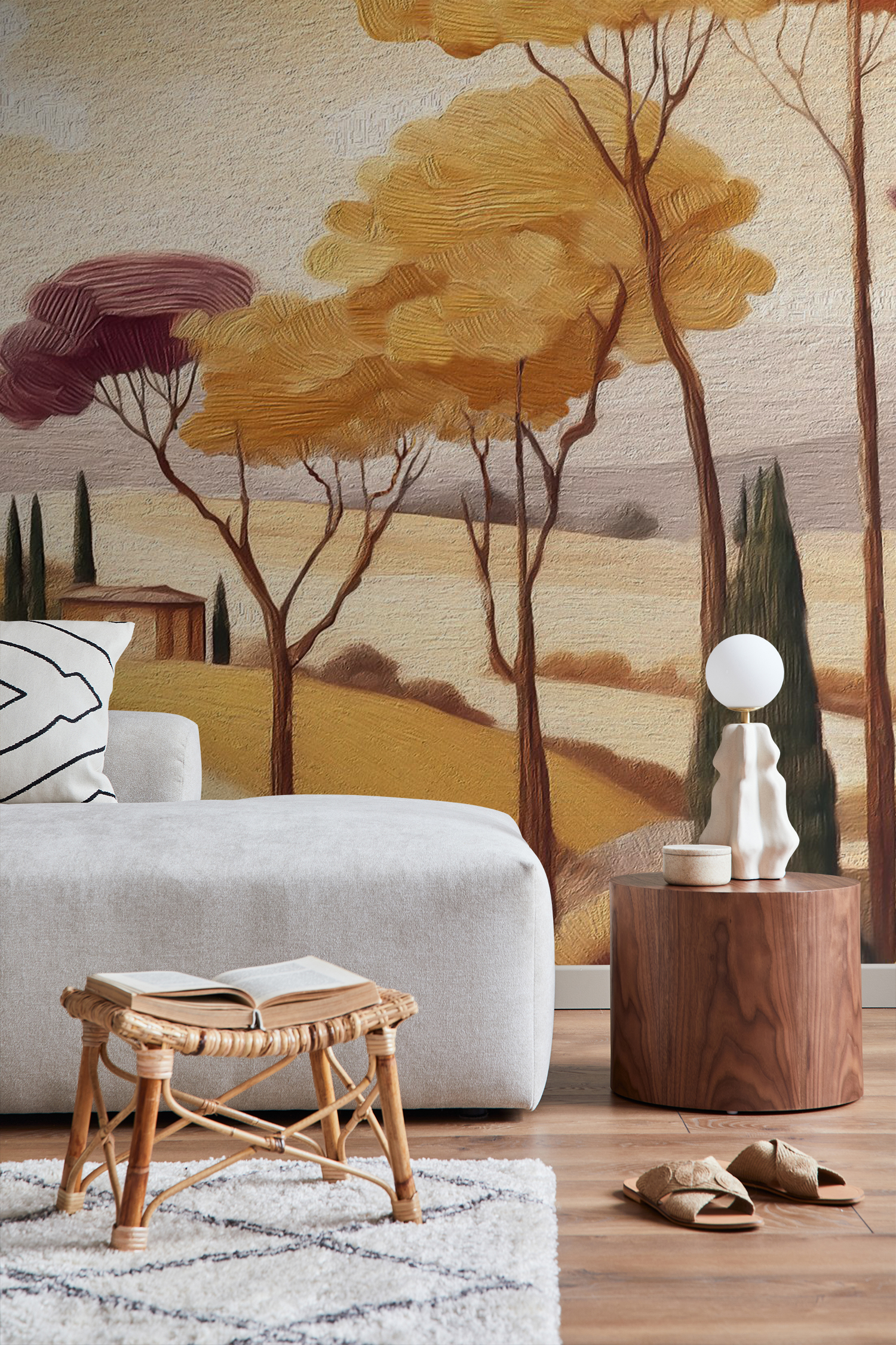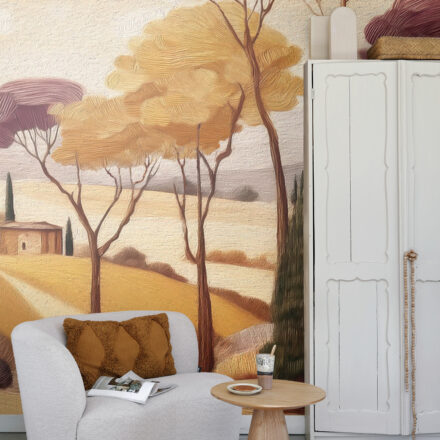 Festett olasz tájkép fotótapéta sárga – lila színkombinációban, melynek melegséget sugárzó árnyalata különlegessé varázsolja otthonod.
