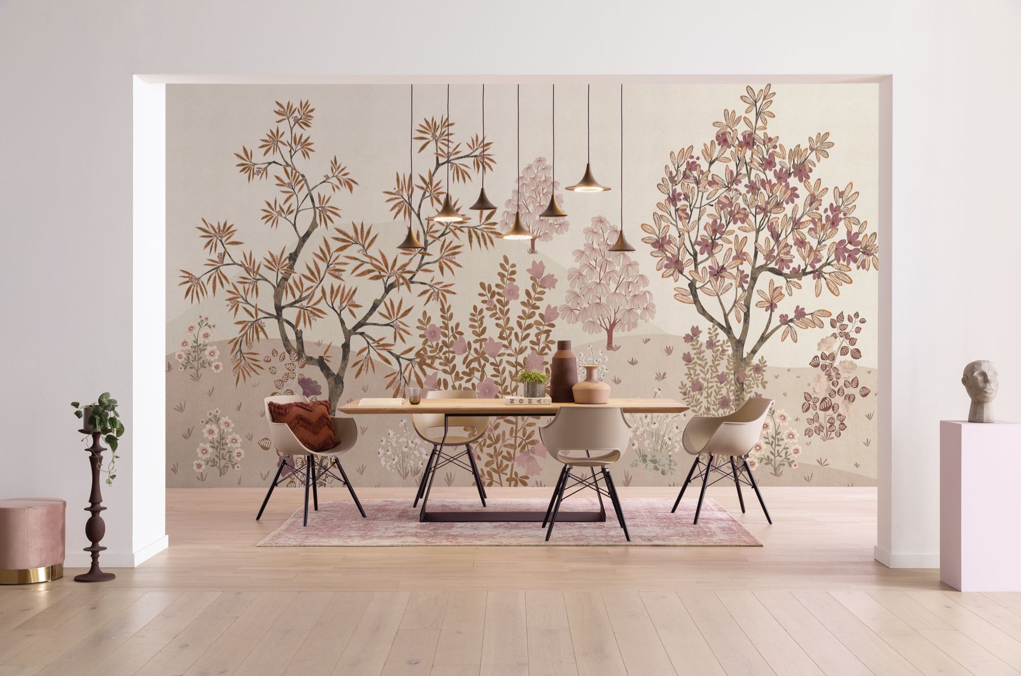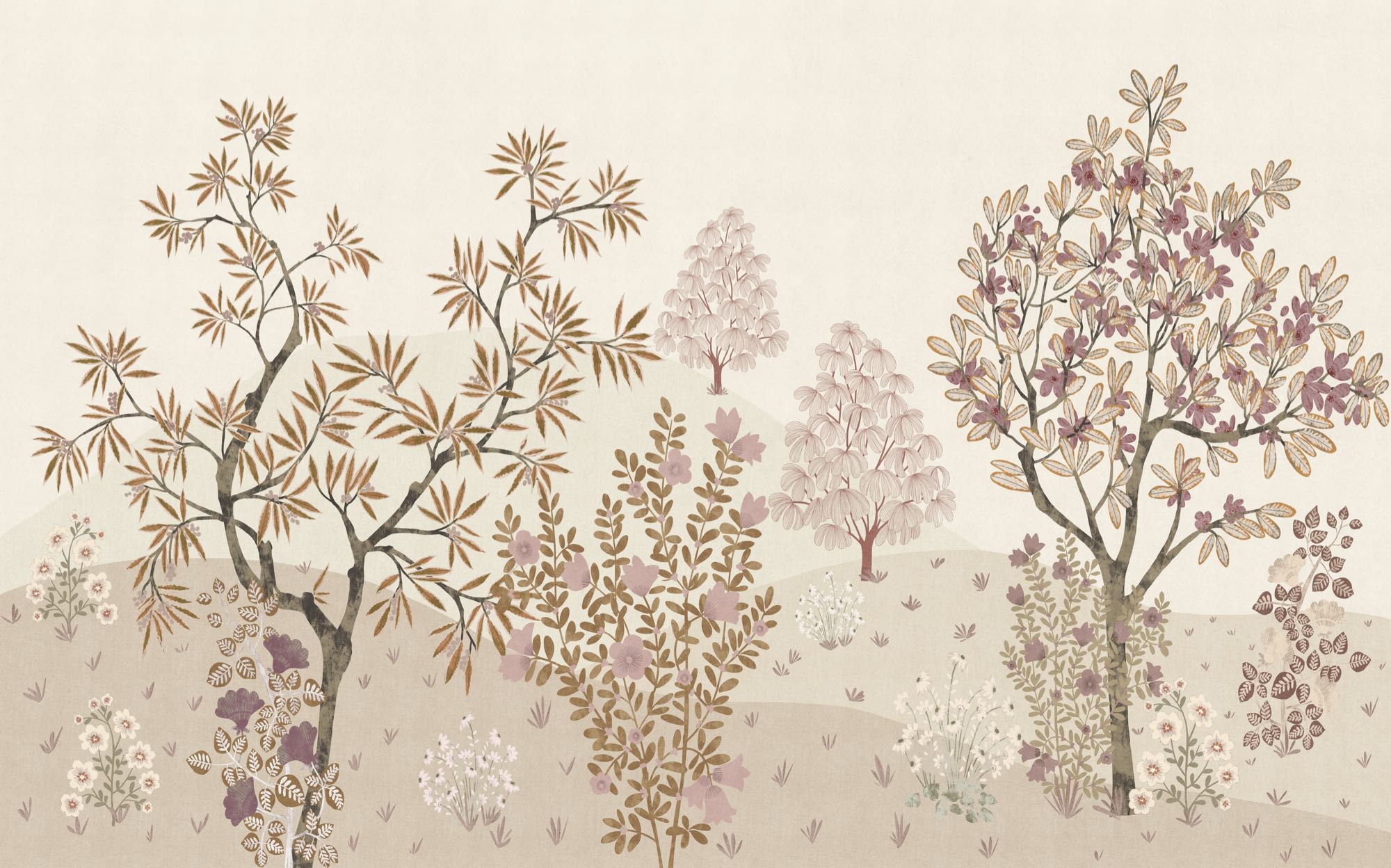 Ez a fotótapéta nyugodt, kiegyensúlyozott világot teremt finoman rajzolt fáival, apró virágaival és lágyan hullámzó dombjaival. A meleg homok-, okker- és púderrózsaszín árnyalatok természetes harmóniát alkotnak, amely egyszerre elegáns és megnyugtató.