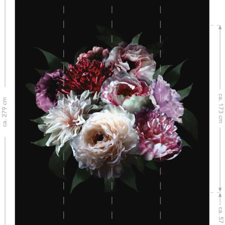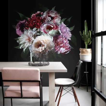 Egzotikus atmoszférát teremt a fekete alapszín, melyből éles kontraszttal emelkedik ki a rózsaszín és lila rózsákból álló virágcsokor. Modern és vintage stílusú otthonokban egyaránt jól használható.