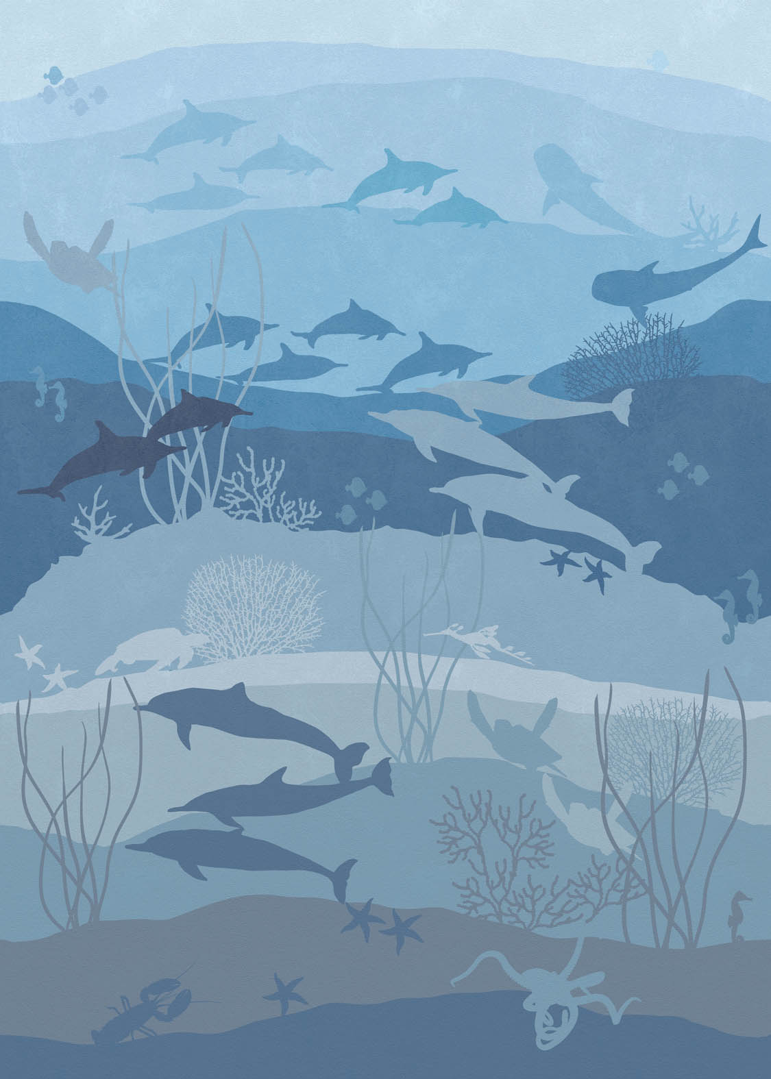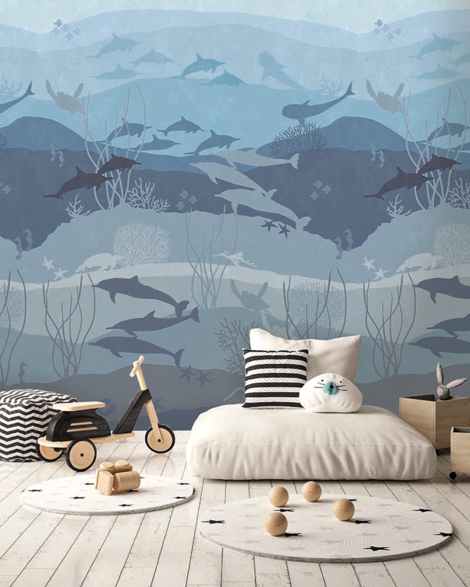 Az óceánok szerelmeseinek ajánljuk a fotótapétát, melyen delfinek és teknősök úsznak gondtalan boldogsággal.