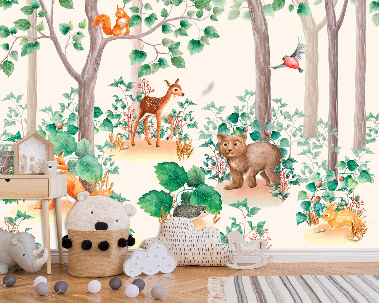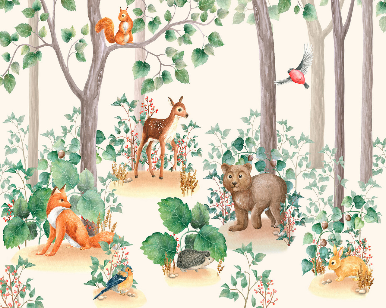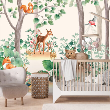 Gyermekrajzok stílusát követő fotótapéta, mellyel otthonos légkört teremthetünk a gyerekszobában. A maci, róka és őzike barátságos képe harmonikus atmozférát teremt, és vidám játékokra inspirál.