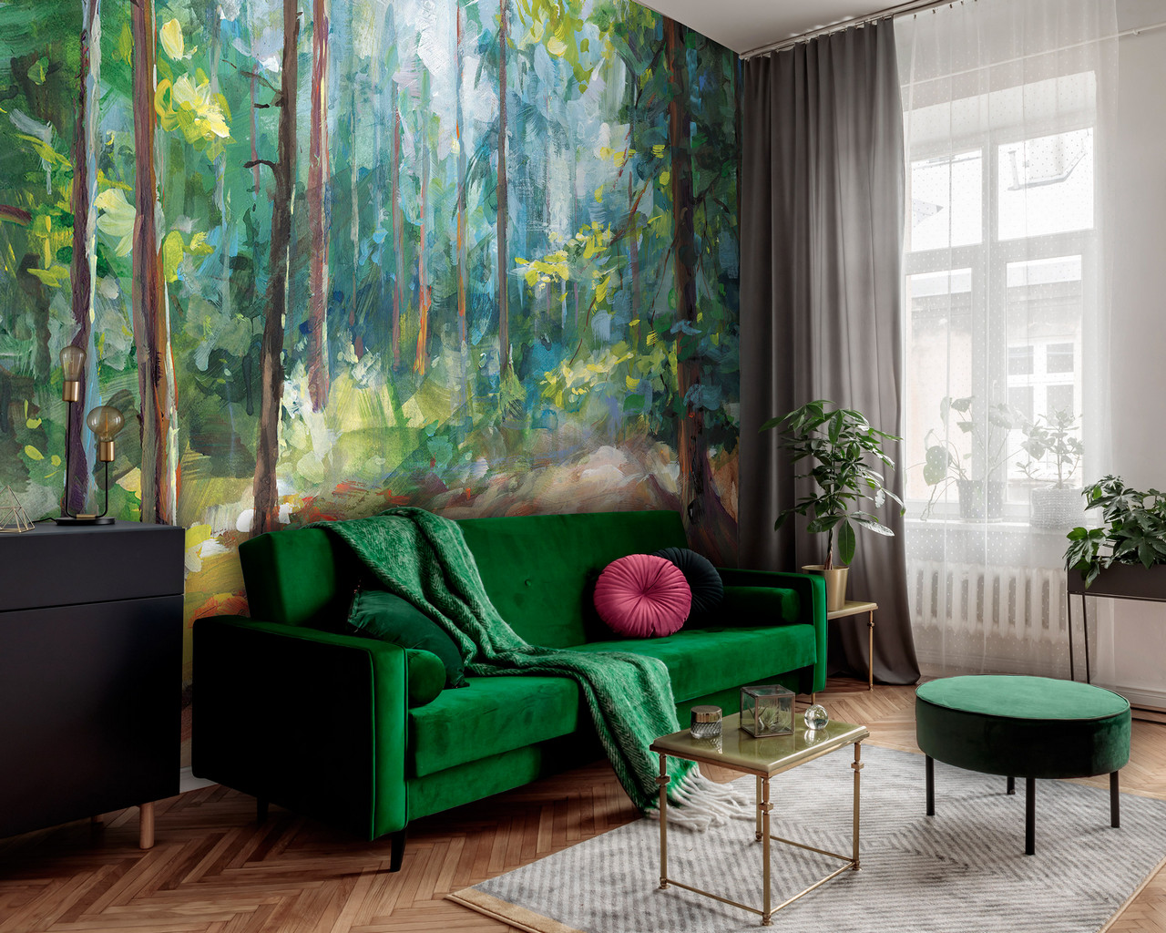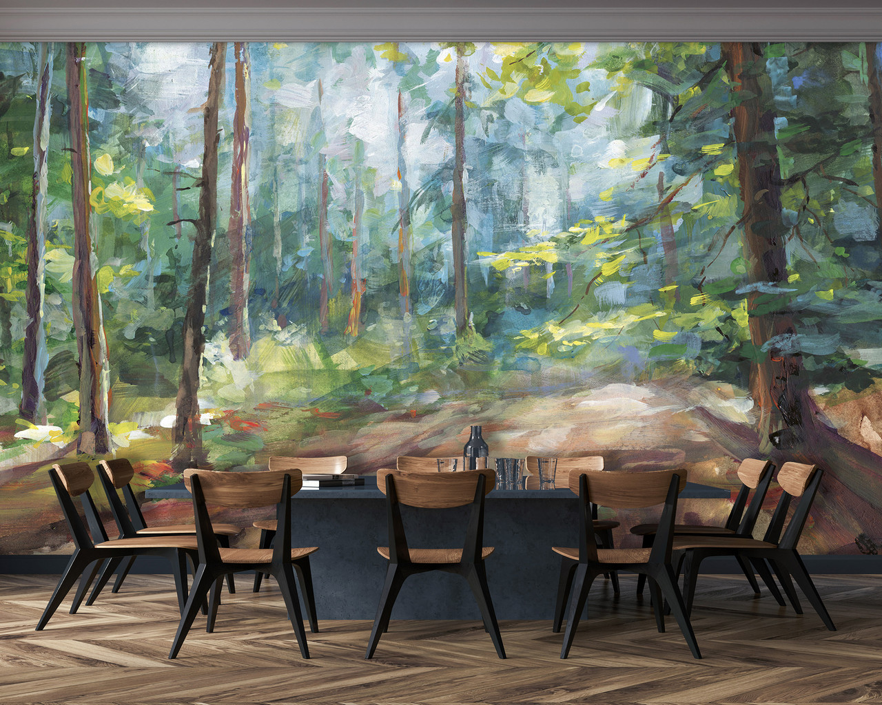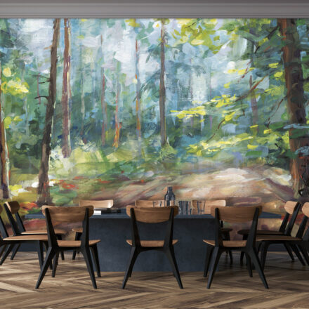 Akvarell festmény hangulatát kelti a fotótapéta, melynek lombos fái az erdei kirándulások nyugalmát és atmoszféráját kelti otthonunkban.